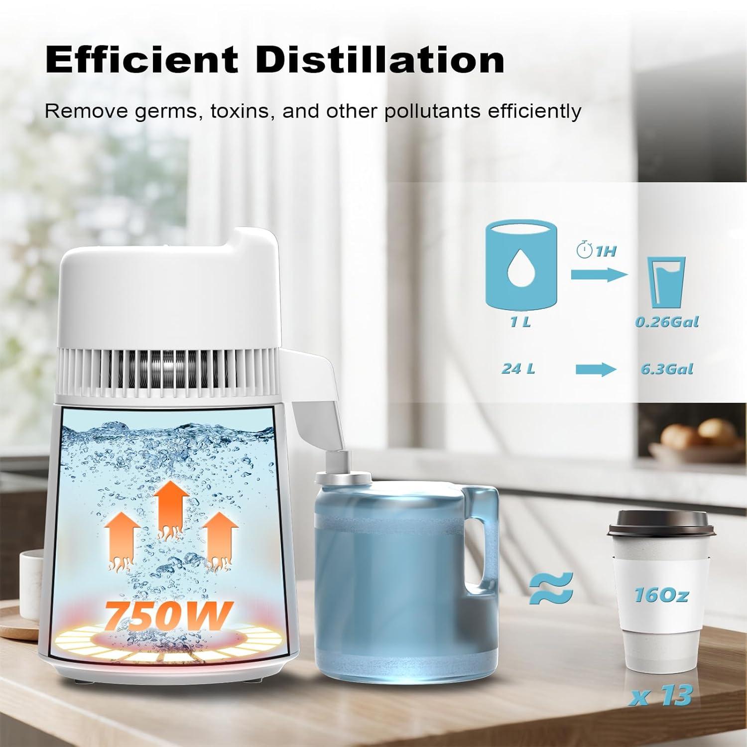 【Efficient Water Distiller】 Featured with 750W high power, this distilled water machine can water up to 1L per hour, and take about 4 hours to finish one round of water distillation. Build-in thermostat to avoid overheating and ensure auto-off. Save more money than buying water at the store