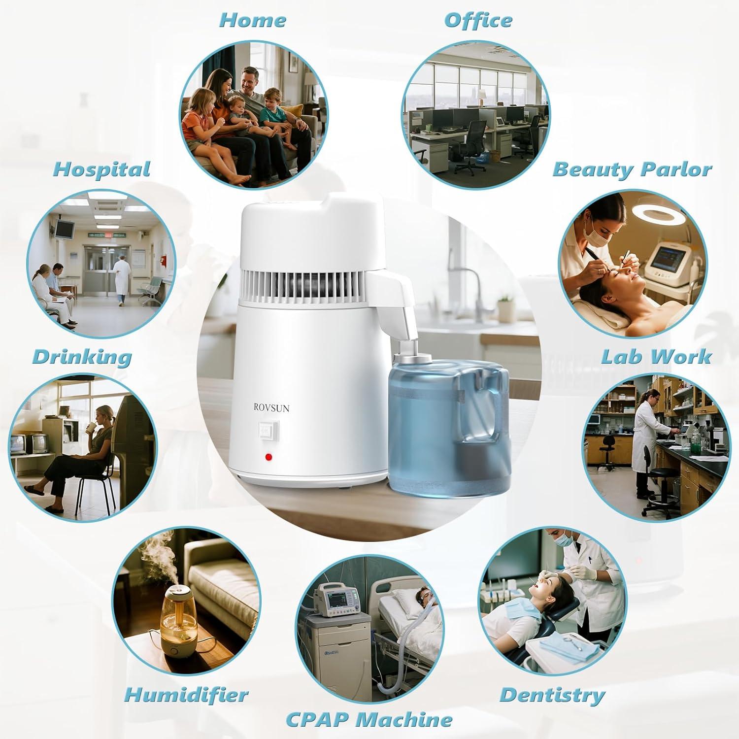 【Widely Applications】 The water distiller is ideal for home and commercial use. It can be widely used in dental products, humidifiers, engine cooling systems, distill wine, evaporators and so on. Low noise so you can run the machine overnight. Portable design makes it easy for you to carry while on vacation. Suit for home, office, labs, hospitals etc.