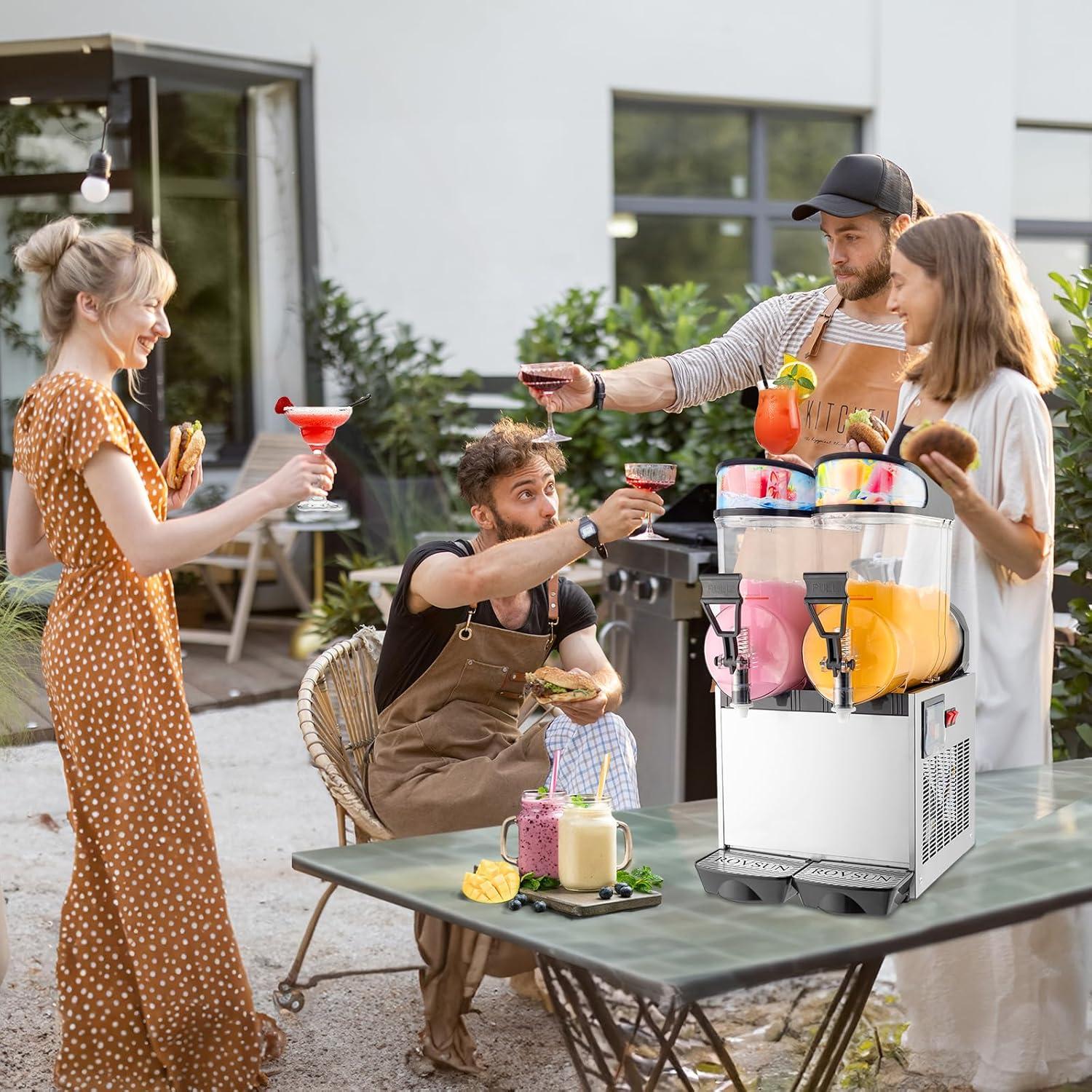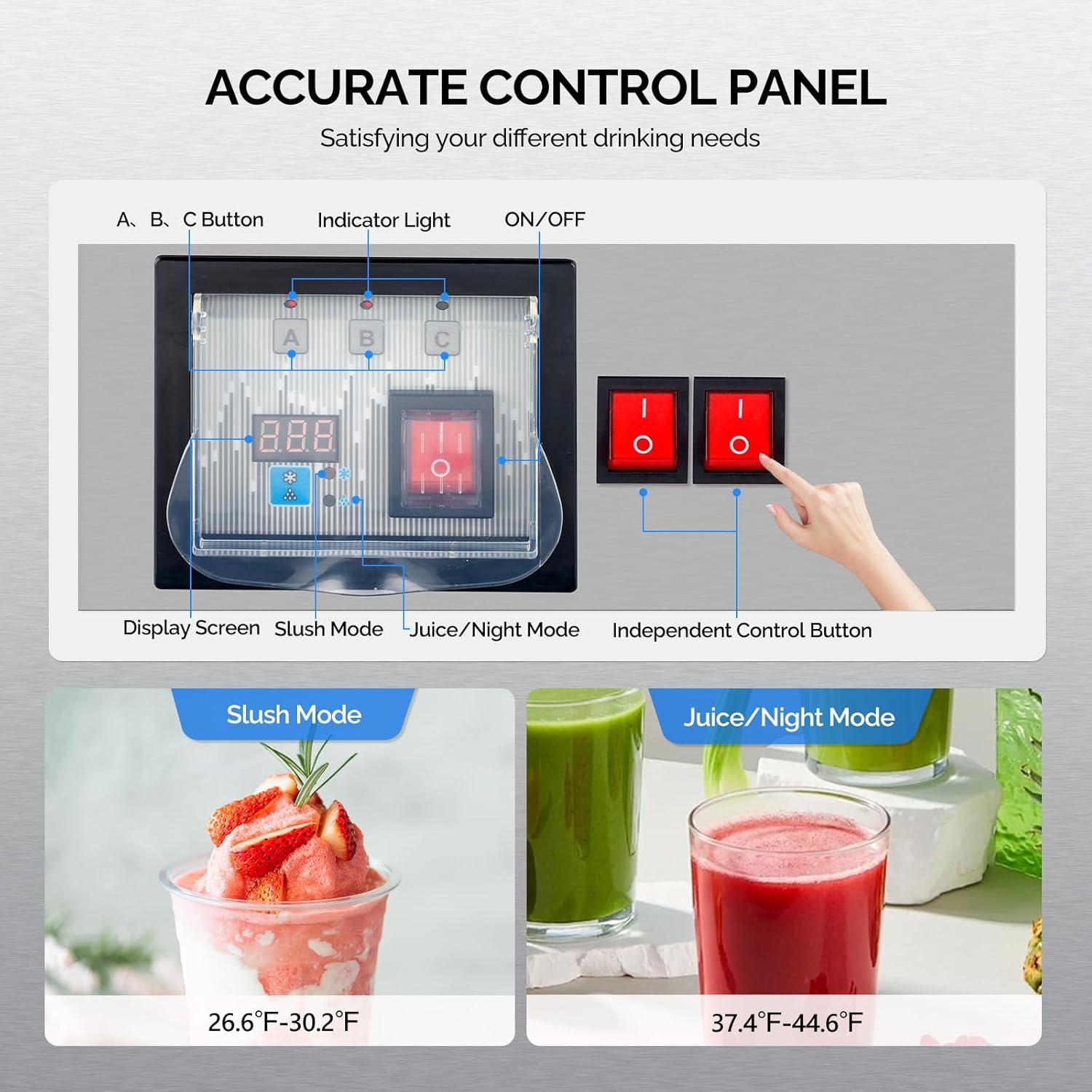 【Large Capacity & Wide Applications】 12 gallons/45 L (4 gal per tank) large bowls hold large amount of slushies with different flavors, temp range of slushie is 26.6℉-30.2℉, temp range of soft drink is 37.4℉-44.6℉, which is perfect for home and commercial use in cafes, restaurants, wineries, bars, parties, etc. to make margaritas, wine slushies or other frozen drinks