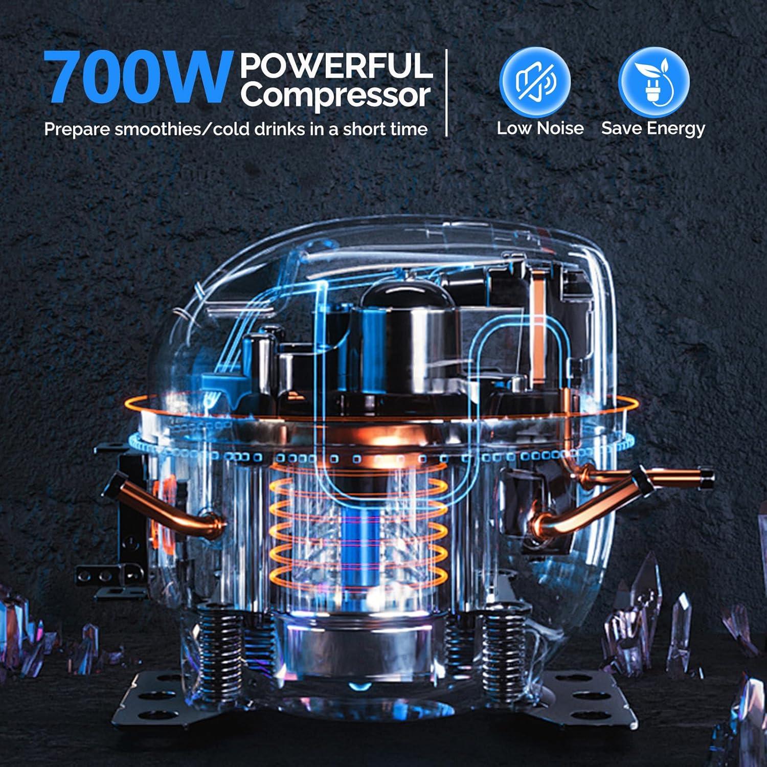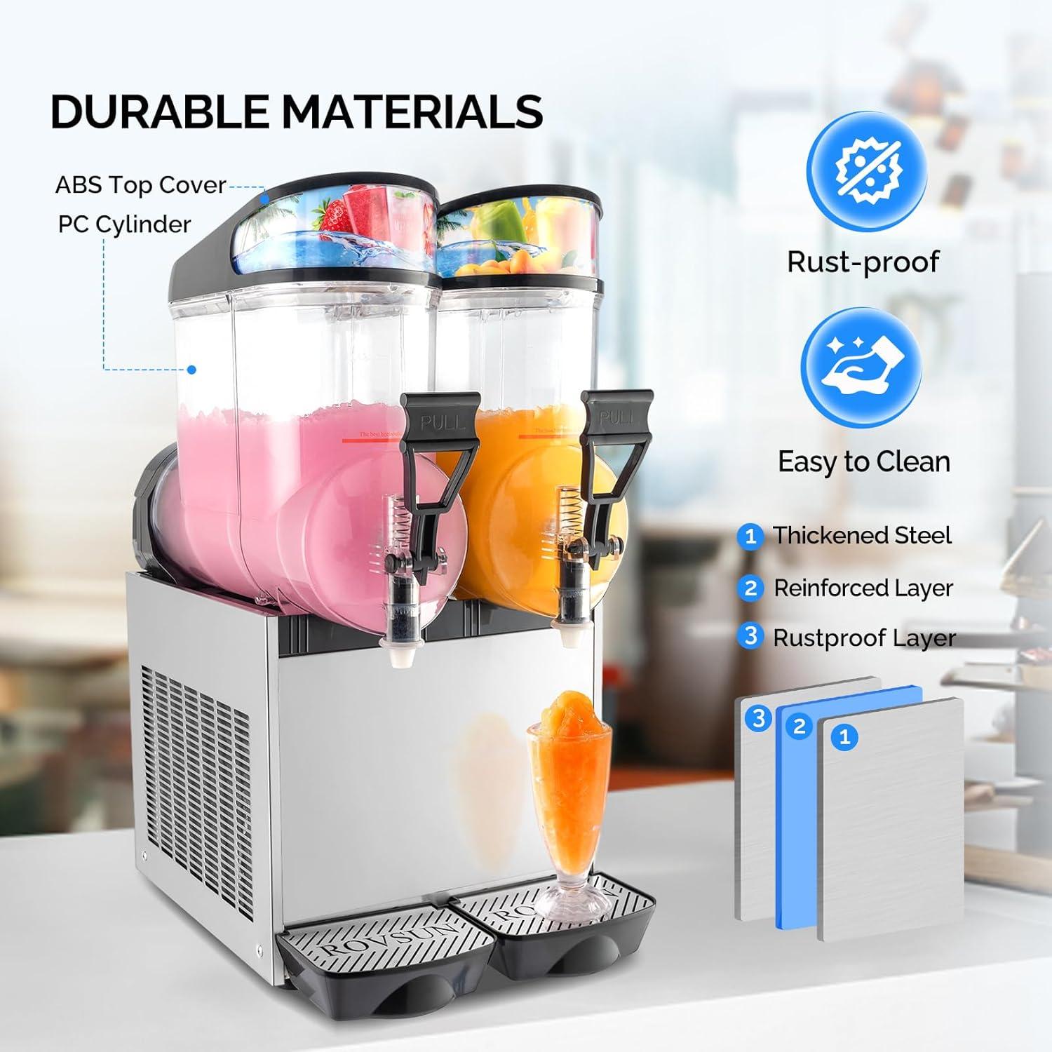 【Durability & Powerful Cooling System】Made of high quality 304 stainless-steel and food-grade PC, the slush machine features long lifespan, corrosion-proof and provides clear vision. The powerful 900W compressor with a full copper condenser ensures fast refrigeration, fast slush production, energy conservation and low noise