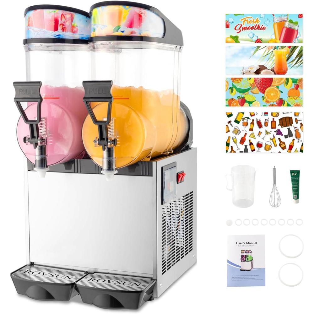 【Considerate Details and Accessories】Detachable drip trays avoid water outflow and make the frozen drink machine easy to clean. The innovative handle conforms to the ergonomic design, easy to pull. Anti-skid feet at the bottom for stability. Comes with practical accessories for convenient usage. Four stickers are included, you could decorate the machine as you like