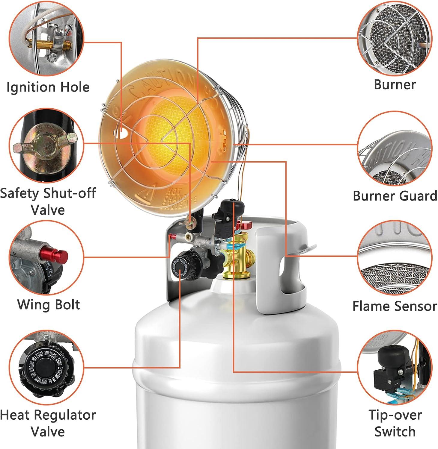 Wide Heating Range: Heater can accommodate and conceal a standard 20-pound propane tank, 15,000 BTU propane tank top heater covers a heating area to 400 Sq in horizontal area and 15 ft radius in vertical area.