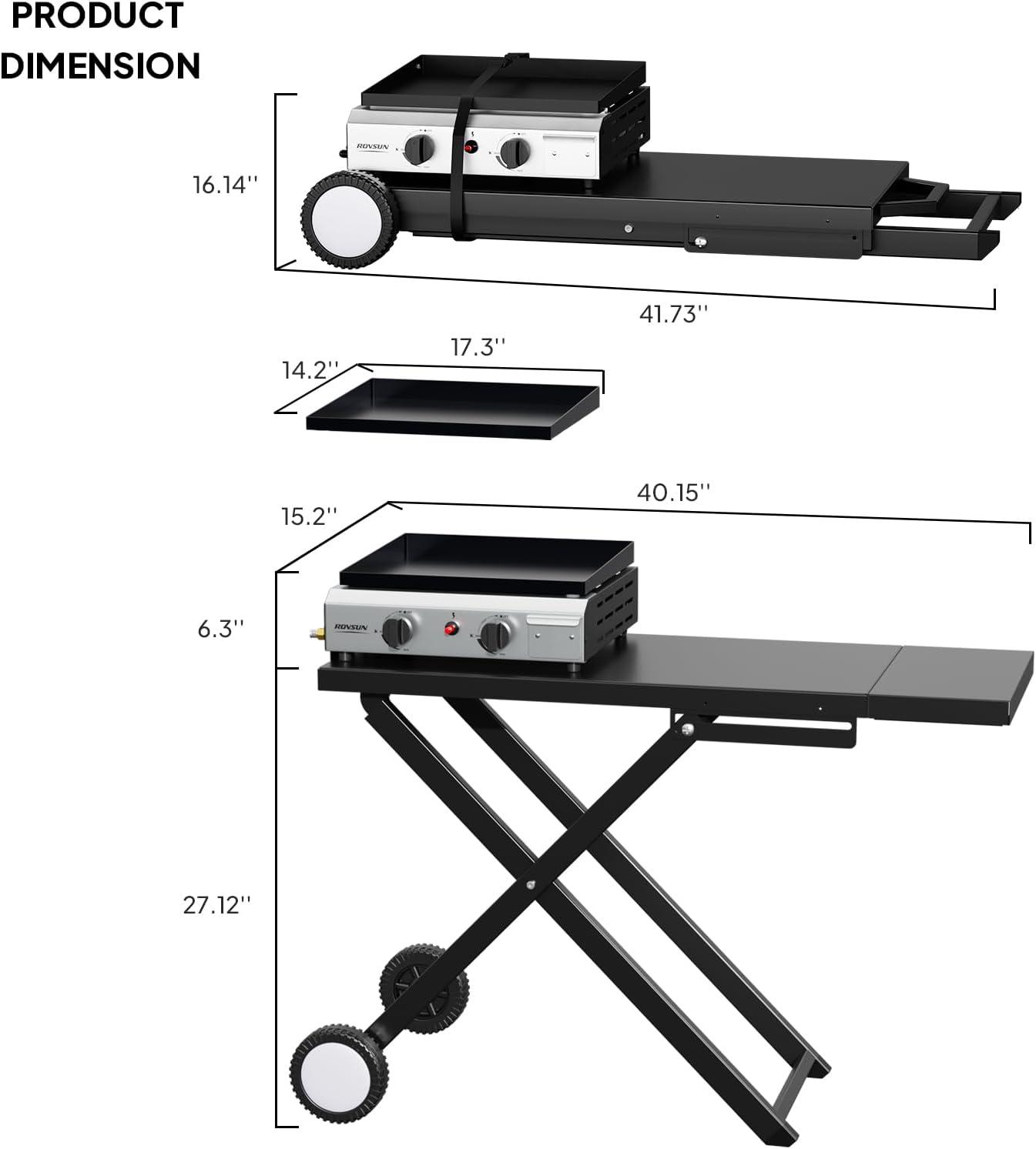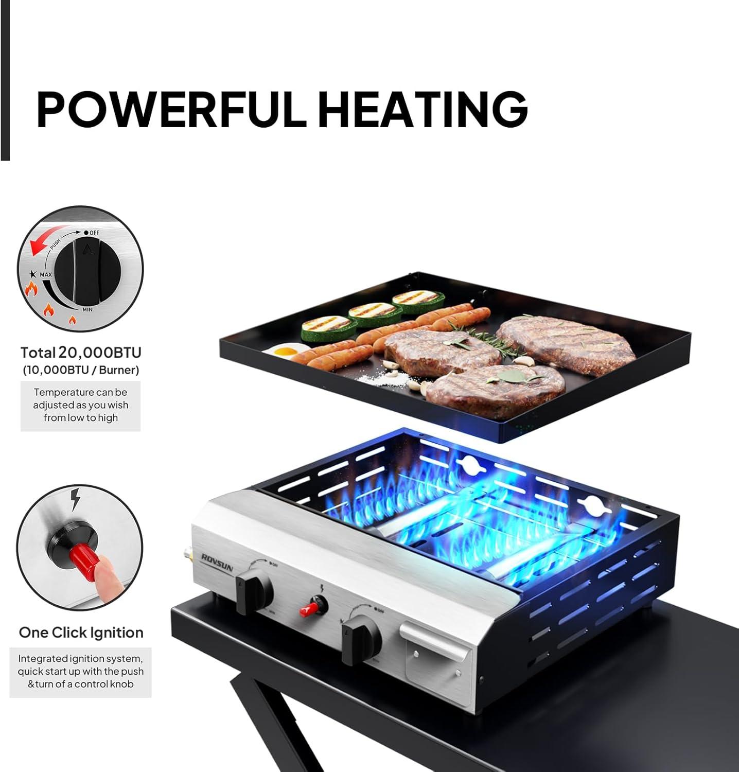 🔥【Powerful Heating】Our product is equipped with 2 independent stainless steel burners, each capable of providing 10,000 BTUs of heat. With both burners in use, you will have 20,000 BTUs of heat that can reach up to 750°F, and you can adjust the flame size as needed, providing a variety of cooking options. Whether it's cooking eggs, pancakes, grilling cheese, or steak, you can do it all with ease