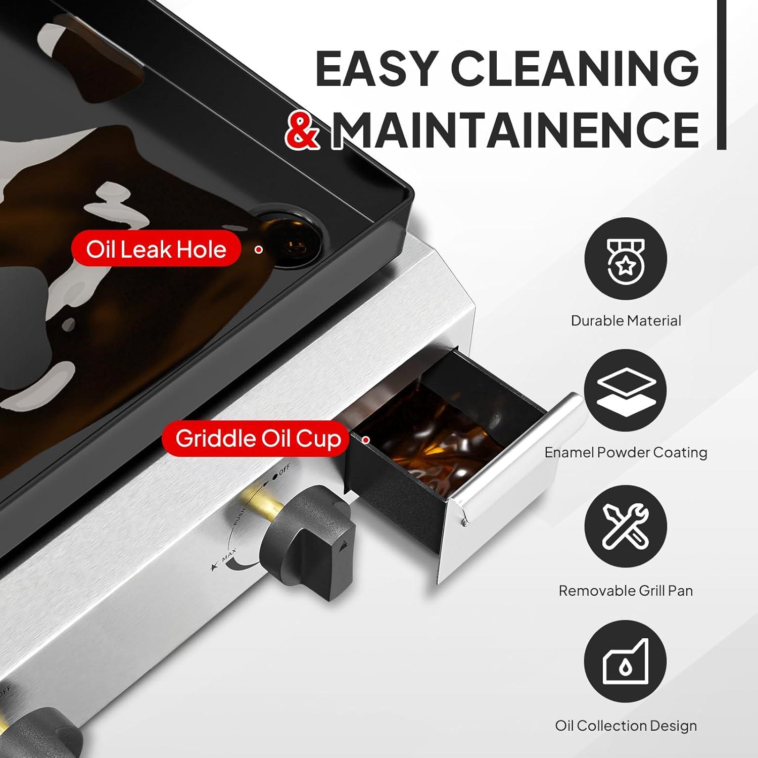 🔥【High Quality Materials】We use high-quality stainless steel and iron to manufacture the griddle, making it very durable. The product is designed with an oil drip tray & nonstick enamel tray for easy cleaning. After cooking, you just need to use a griddle brush to clean the cooking grates, and then wipe the exterior of the gas grill with a cleaning cloth