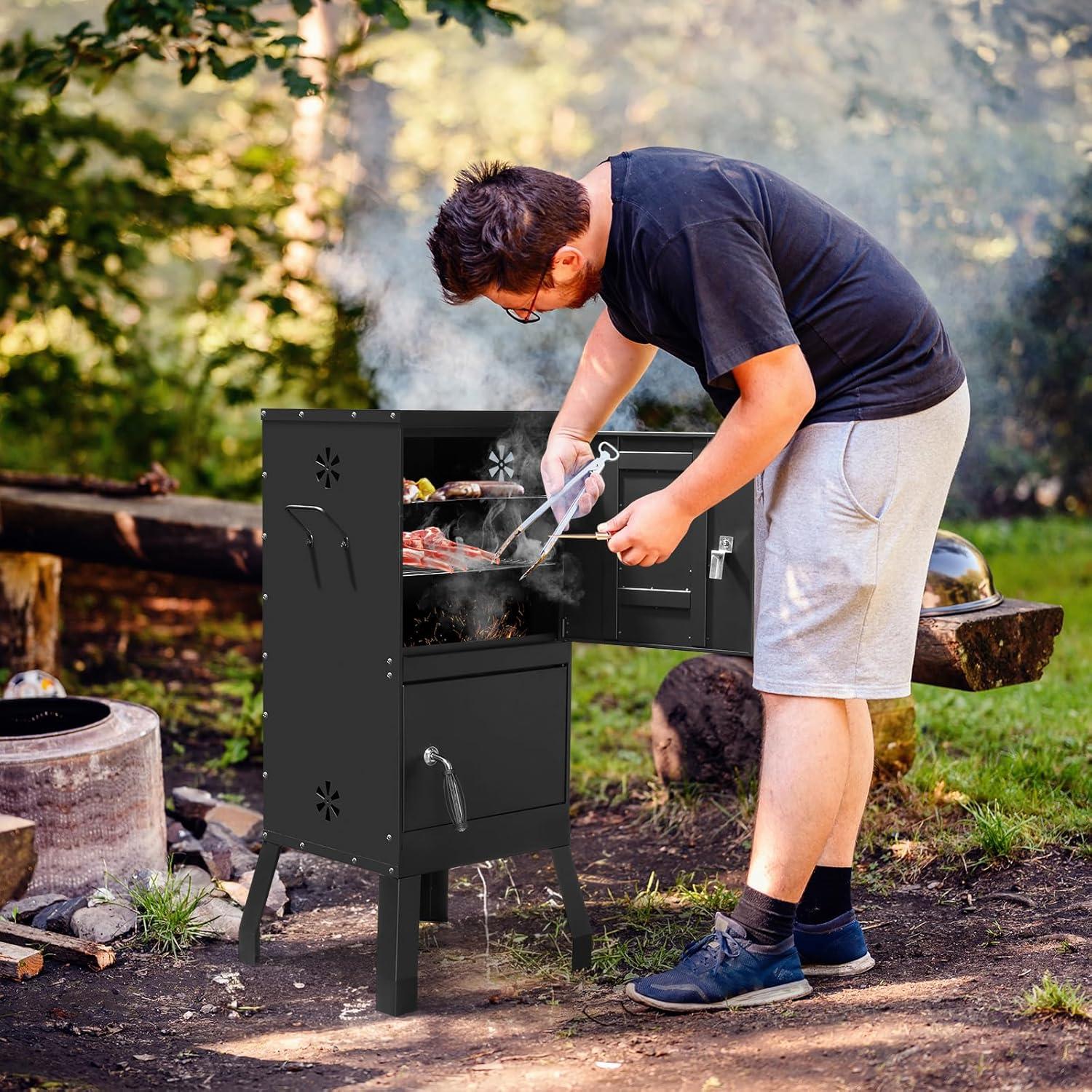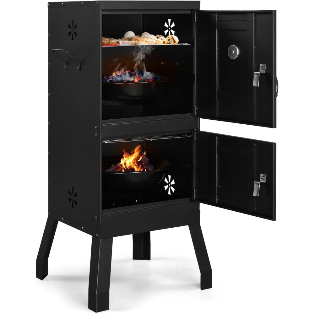ROVSUN 2-in-1 Outdoor Smoker with Double Doors, Vertical Portable Charcoal Grill with Two Detachable Grill Smoking Racks and Charcoal Pan, Perfect for Camping Barbecue, Black