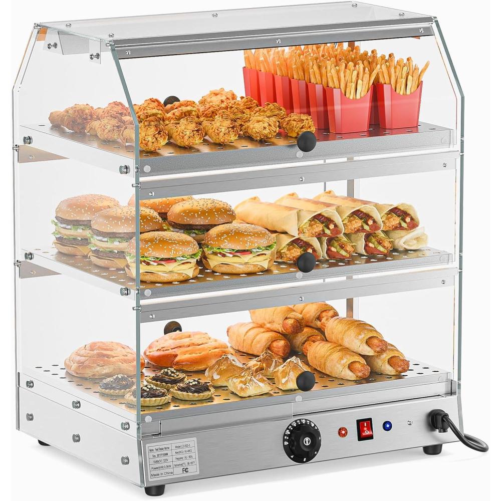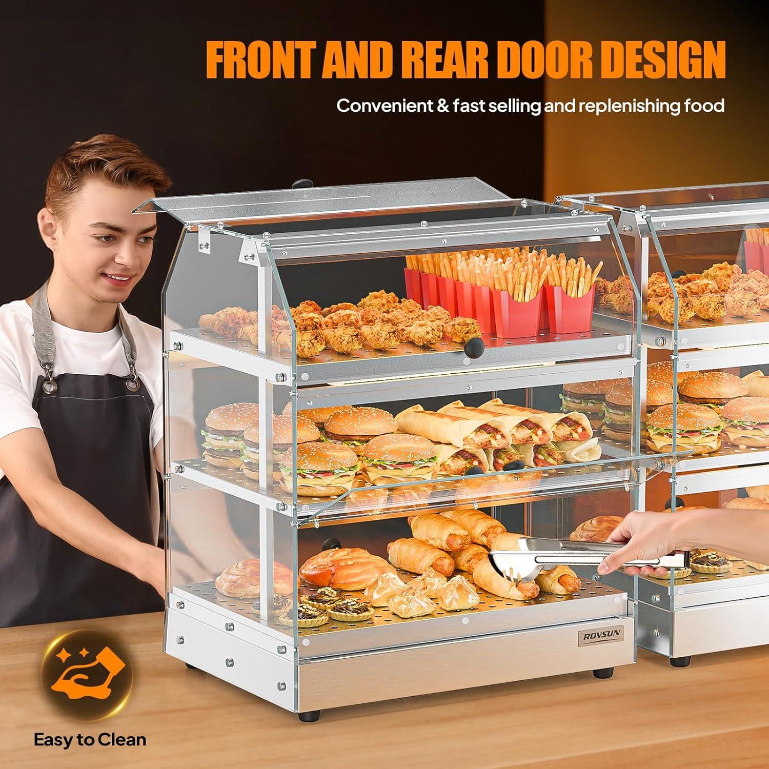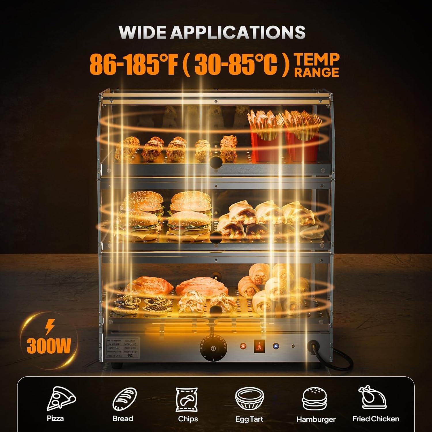 【Versatile Temperature Control】Adjust the temperature between 86-185°F with simple dial controls to suit various foods, from delicate pastries to hot sandwiches. The built-in thermostat maintains consistent warmth, preserving food quality during extended display periods. Ideal for buffets, delis, and restaurants needing flexible food warming solutions