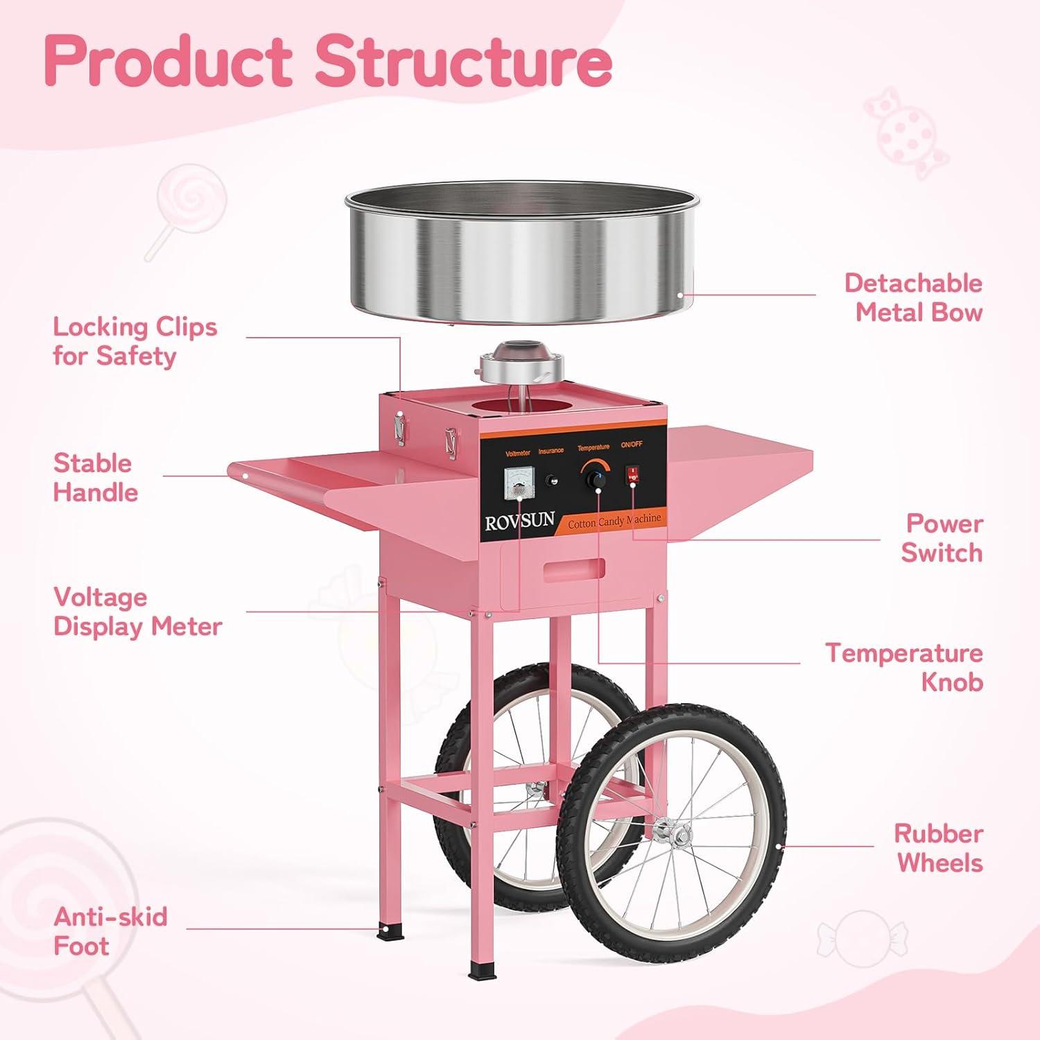 imageROVSUN 21 Inch Cotton Candy Machine Cart Electric Cotton Candy Maker Candy Floss Machine wCover Stainless Steel Bowl Sugar Scoop and Large Storage Drawer for Commercial Home Party Carnival PinkPinkwithout Cover