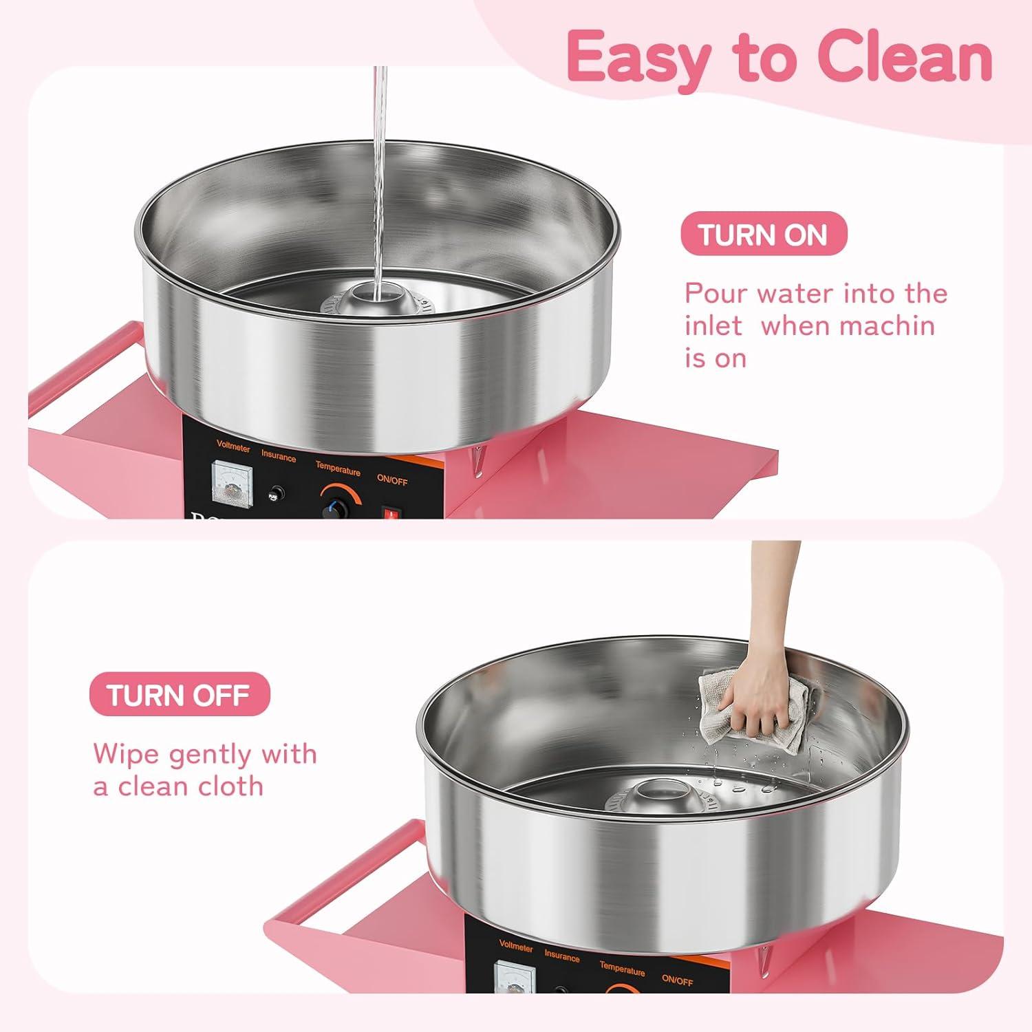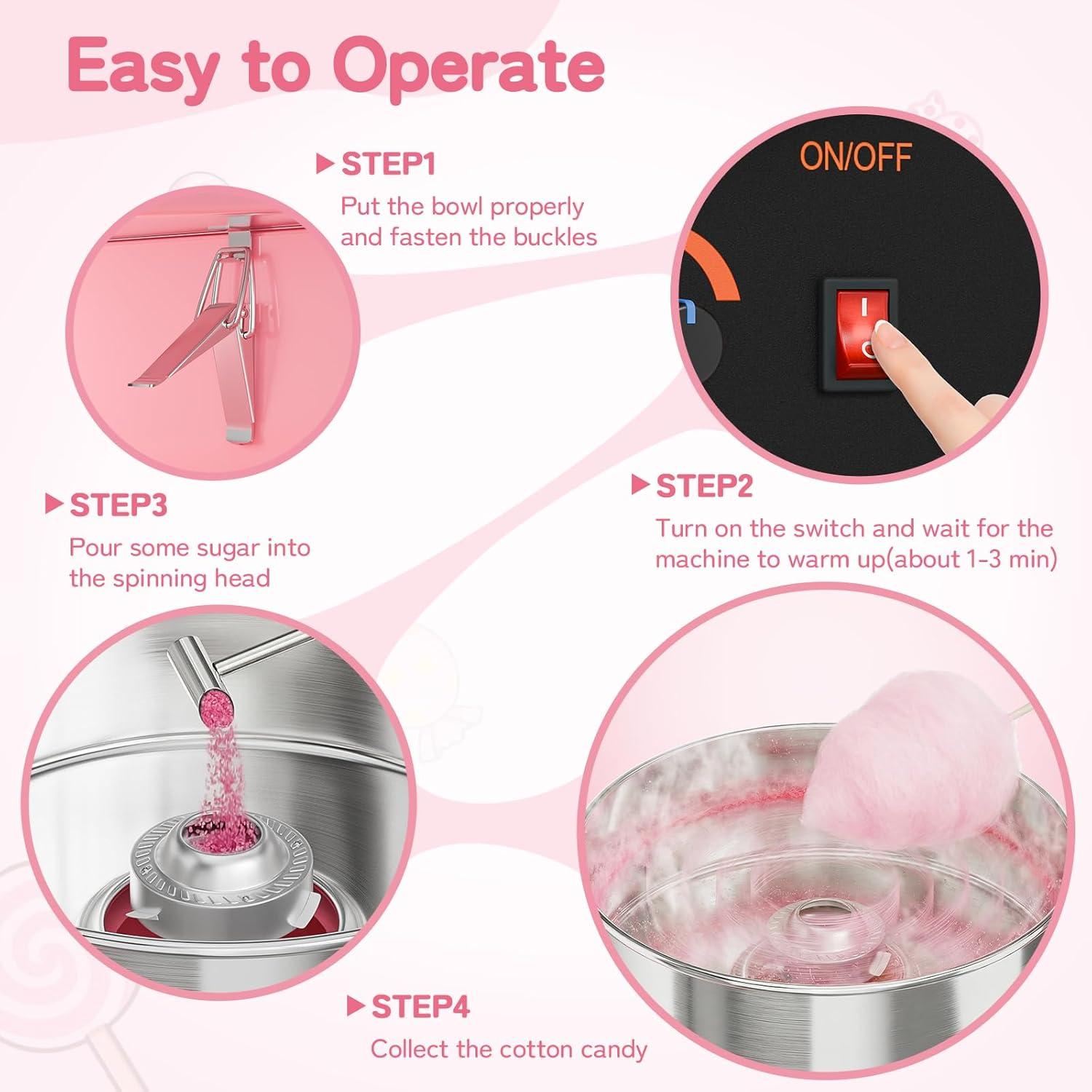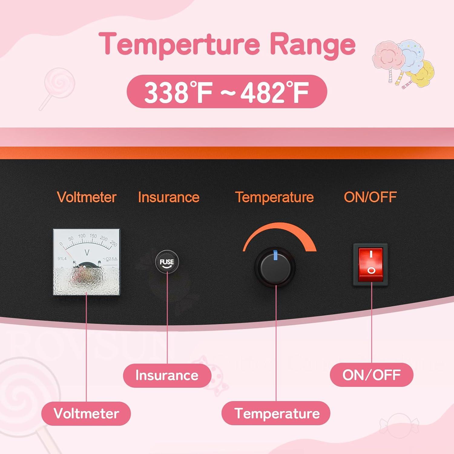 【Easy Operation & Cleaning】Just turn on the power, adjust the temperature (338-482℉), warm up for 5-6 minutes, pour the sugar into the cap, then within minutes delicious cotton candies could be made. Locking clips minimize vibration in process and help to hold down the bowl. Adjustable temperature makes it suitable for different candies. The detachable pan makes it easy to clean