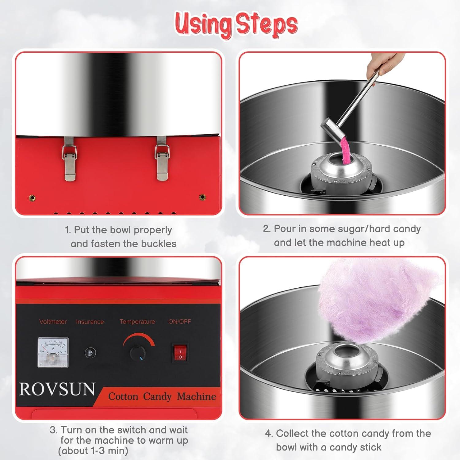 【Easy Operation & Cleaning】Just turn on the power, adjust the temperature (338-482℉), warm up for 5-6 minutes, pour the sugar into the cap, then within minutes delicious cotton candies could be made. Locking clips minimize vibration in process and help to hold down the bowl. Adjustable temperature makes it suitable for different candies. The detachable pan makes it easy to clean