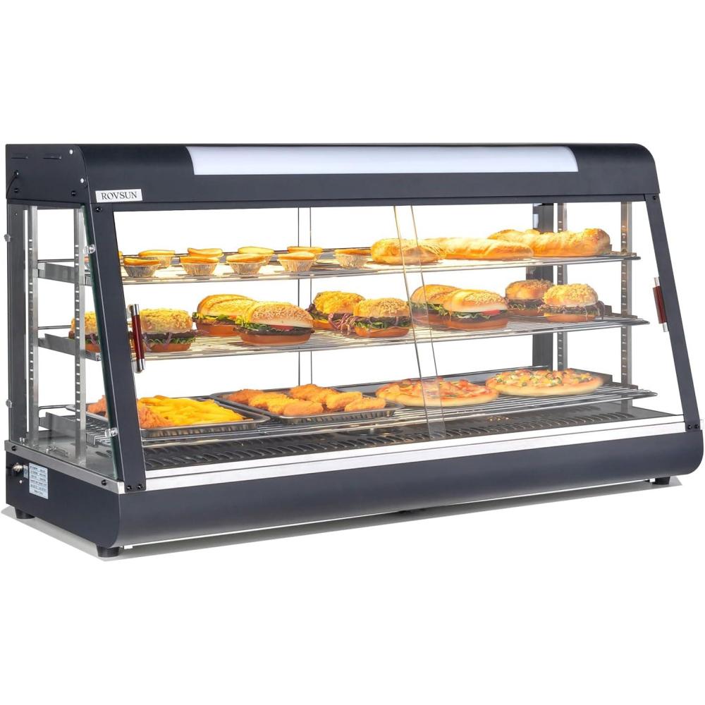 【User-friendly Design】Interior LED Lighting at the top for illuminating the display case, bright and eye-catching. Equipped with removable shelves and removable bottom tray, the food warmer is great for customizable food storage and easy for cleaning. One panel controlling makes it easy to operate