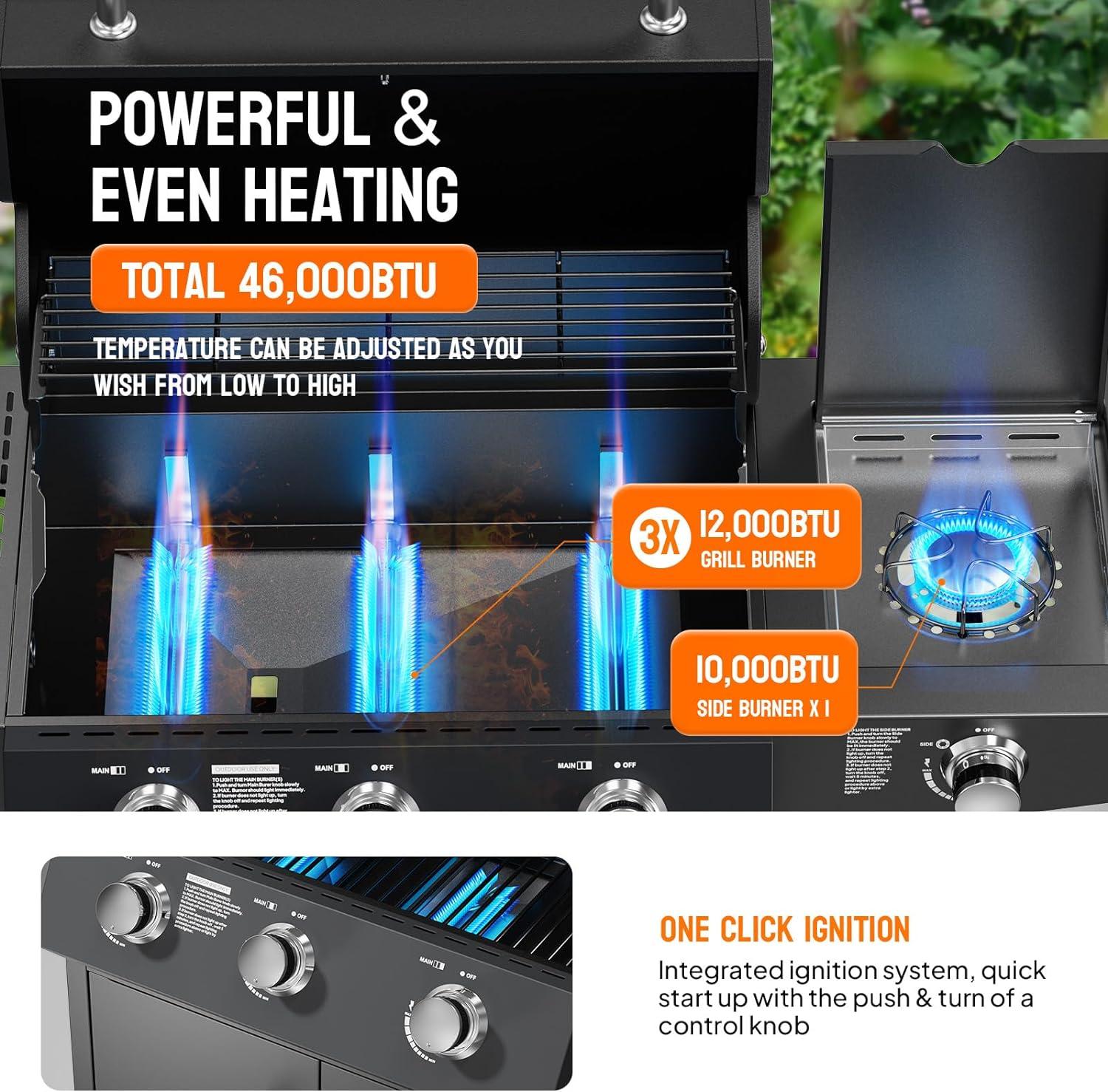 šŸ”„ć€Powerful Heating怑This propane grill is equipped with 3 independent stainless steel grilling burners, which provide a total 36,000 BTU of grilling burners. And you can adjust the flame size as needed, providing a variety of cooking options. Whether it's cooking eggs, pancakes, grilling cheese, or steak, you can do it all with ease