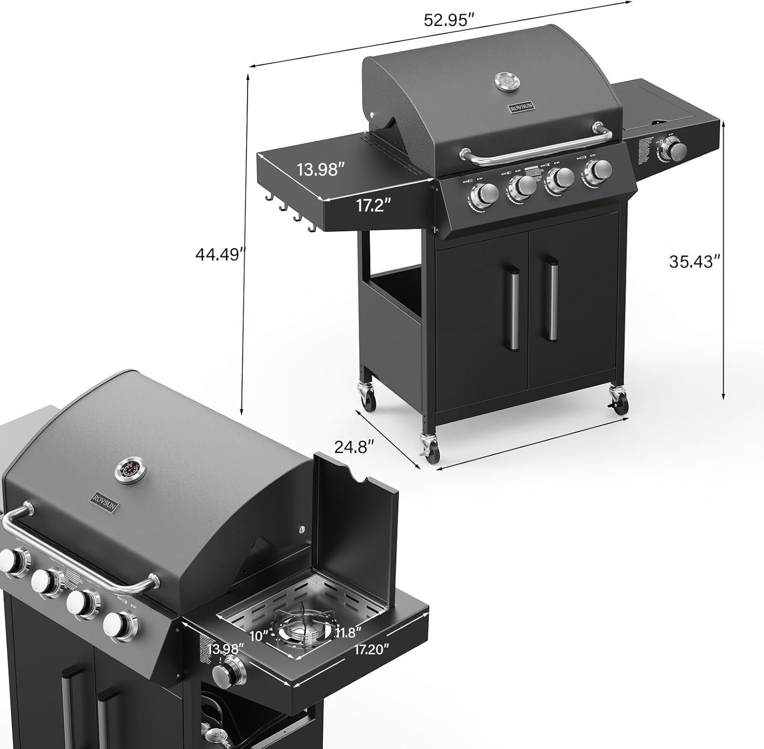 ROVSUN 3 Burner Propane Gas Grill with Foldable Side Shelves, 36000BTU BBQ Grills with Enameled Cast Iron Grates, Cabinet & Poratable Rolling Wheels for Outdoor Garden Patio Backyard Barbecue Cooking(4 Burner with Side Burner)