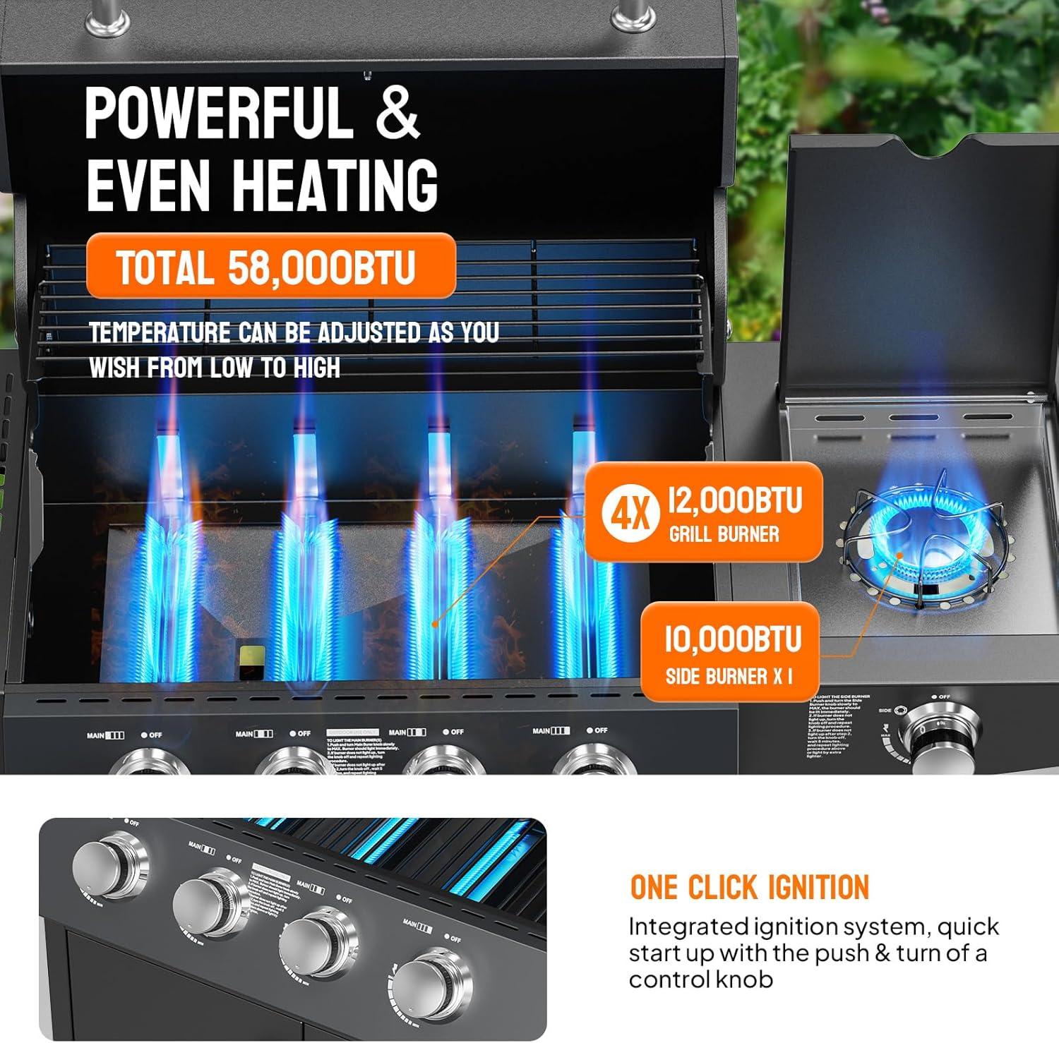 đŸ”„ă€Powerful Heating】This propane grill is equipped with 3 independent stainless steel grilling burners and 1 side cooking burner, which provide a total 46,000 BTU of cooking power including 36,000BTU grilling burners and 10,000 BUT side burner. And you can adjust the flame size as needed, providing a variety of cooking options. Whether it's cooking eggs, pancakes, grilling cheese, or steak, you can do it all with ease