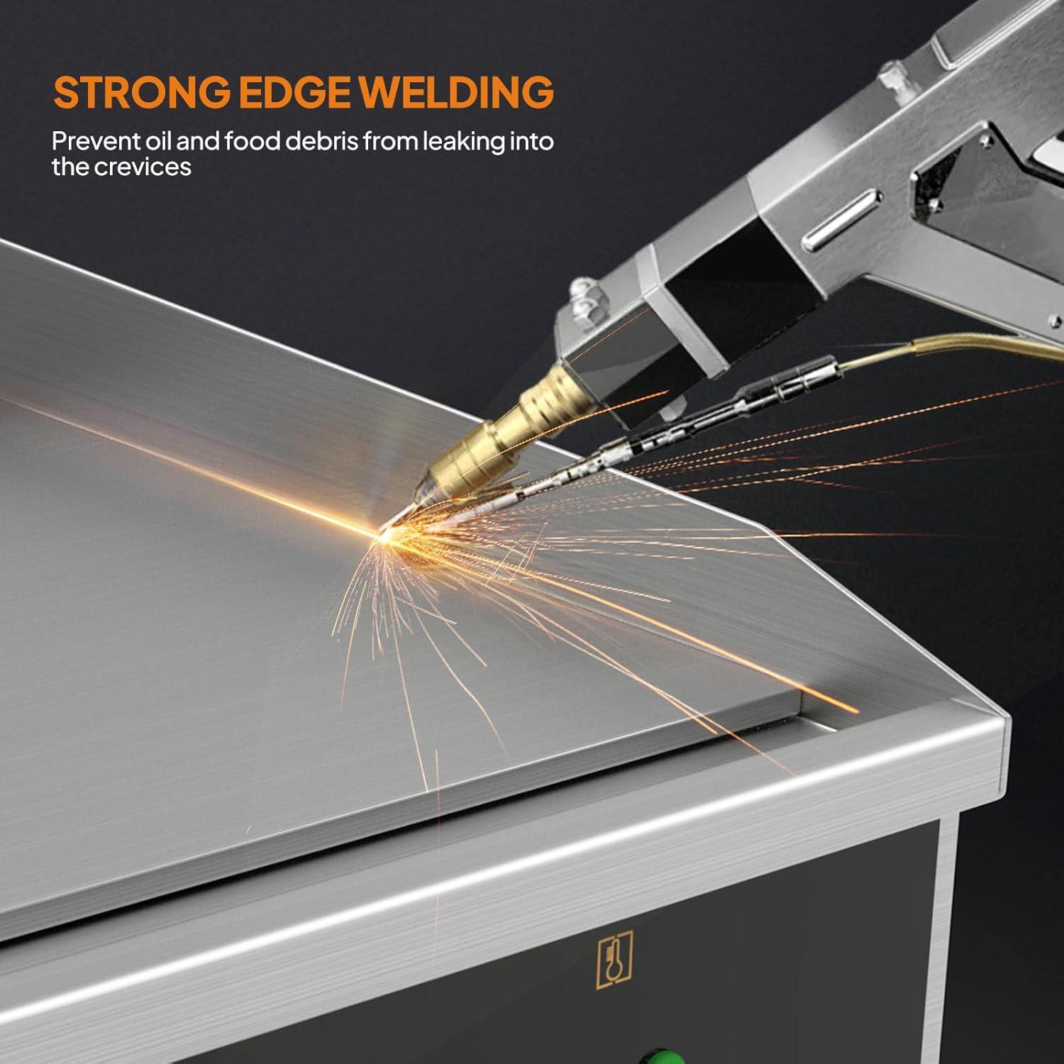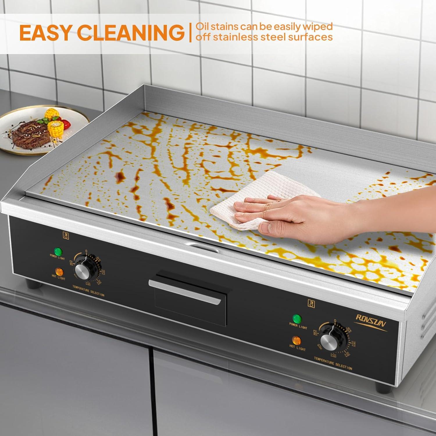 Effortless Cleaning Maintenance: Designed with busy kitchens in mind, our flat top grill features a non-stick cooking surface and removable grease catch pan for quick and easy cleanup. The smooth seasoned cooking surface prevents food from sticking. Simply wipe down after cooking, and you're ready for your next culinary creation. The corrosion-resistant stainless steel construction ensures long-lasting durability and easy maintenance