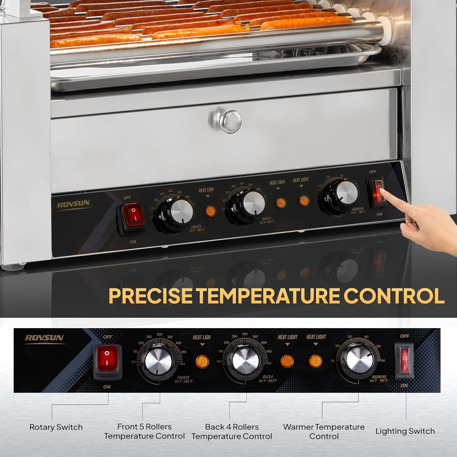 【Precise Temperature Control】Dual temperature controls for front and back rollers allow you to cook sausages at ideal temperature (Operating temp 86 – 482℉, bun warmer temp 86 – 185℉) . Slow rotation of rollers keeps hotdogs moving to ensure even cooking and a juicy and delicious taste