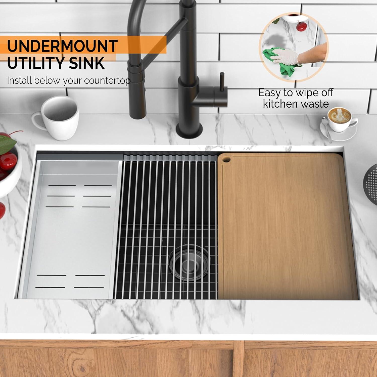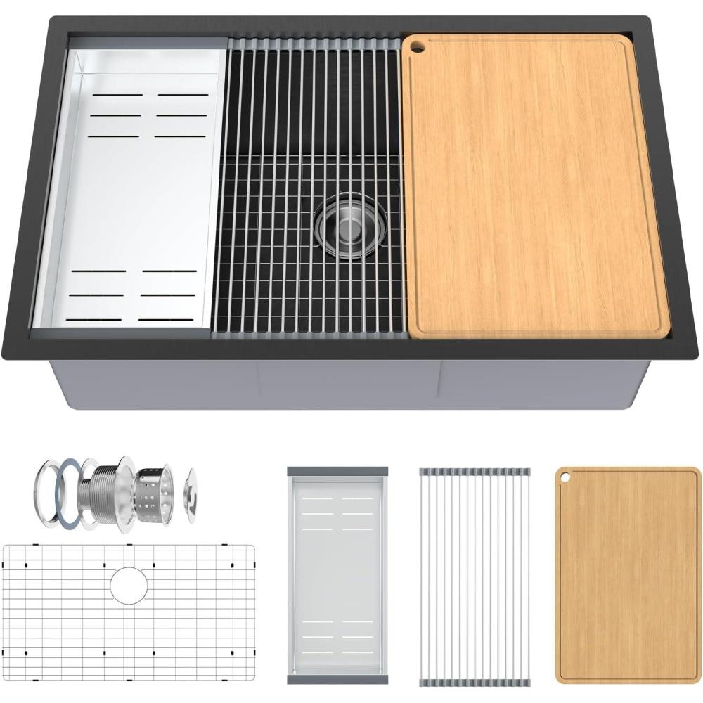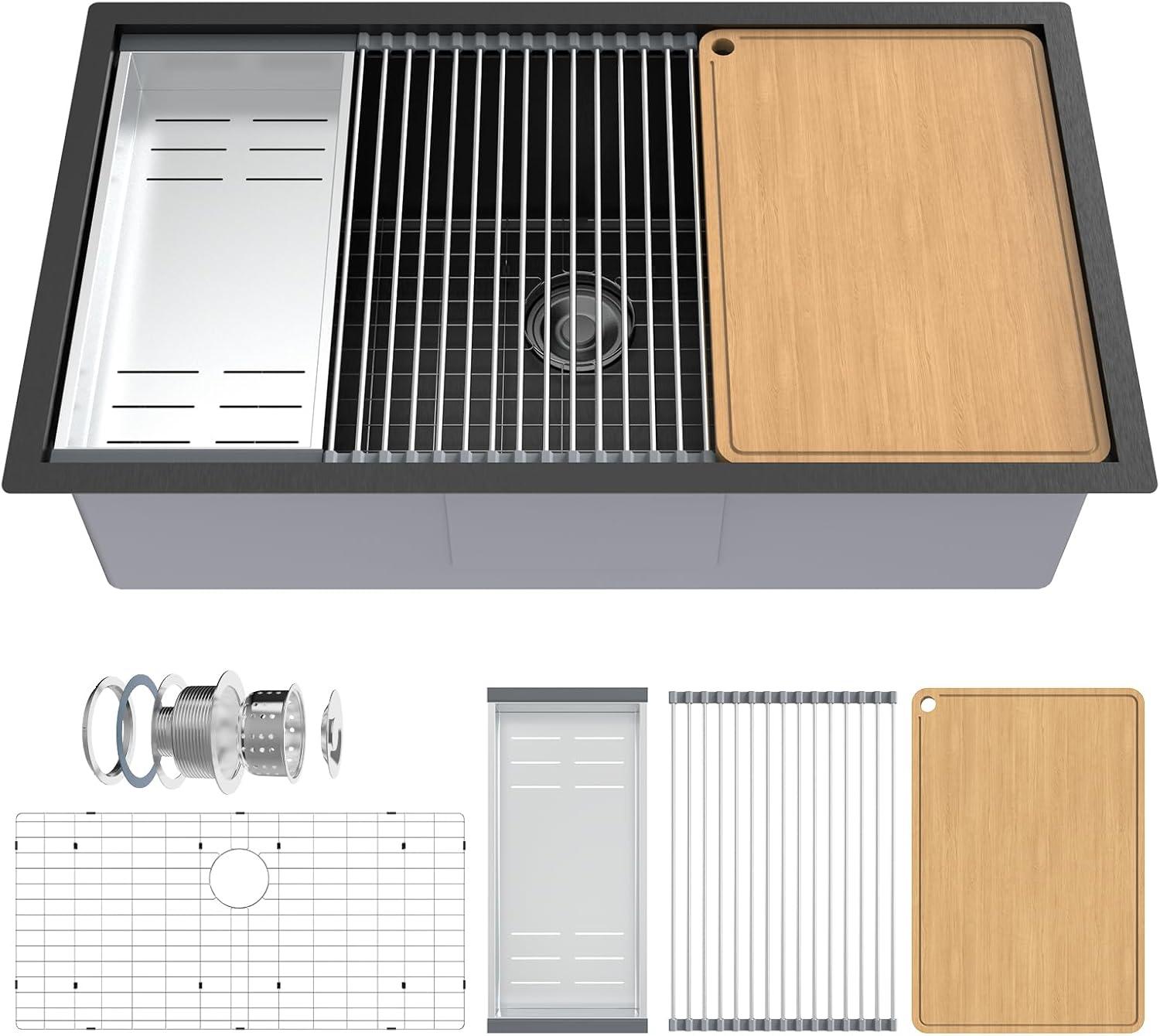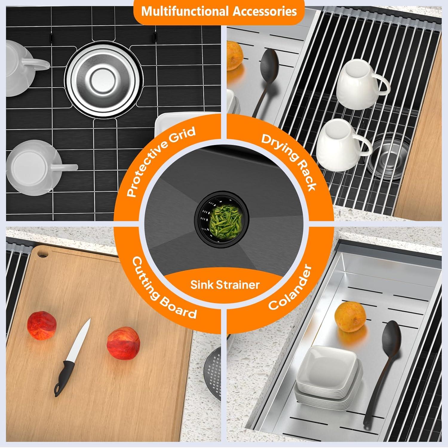 All-in-One Functional Design: This kitchen sink comes with a built-in drying rack, drain basket, and cutting board, offering a complete solution for washing, drying, and food prep in one convenient space.