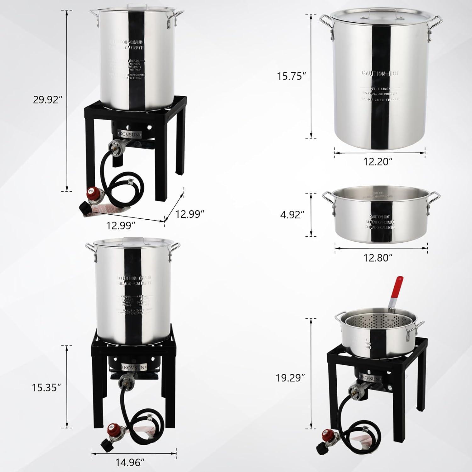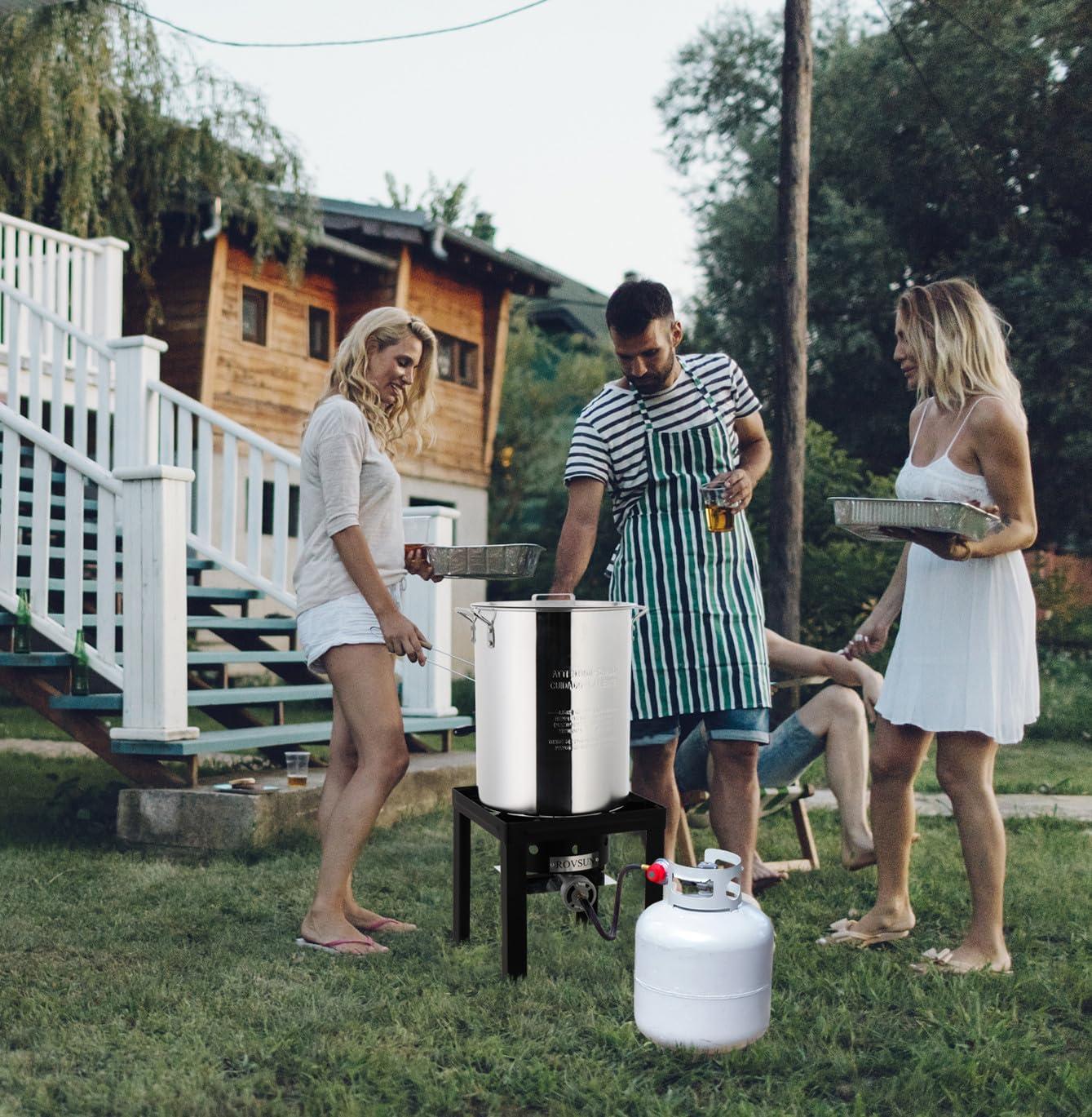 🍗【30QT Multi-functional Fryer & Boiler】Use the basket to deep fry chicken, fish or hush-puppies; steaming or boiling seafood, clams and vegetables. Use without basket to boil soups, stews, gumbo, jambalaya, and low country boil. Perfect for backyard parties, camping or other outdoor activities.