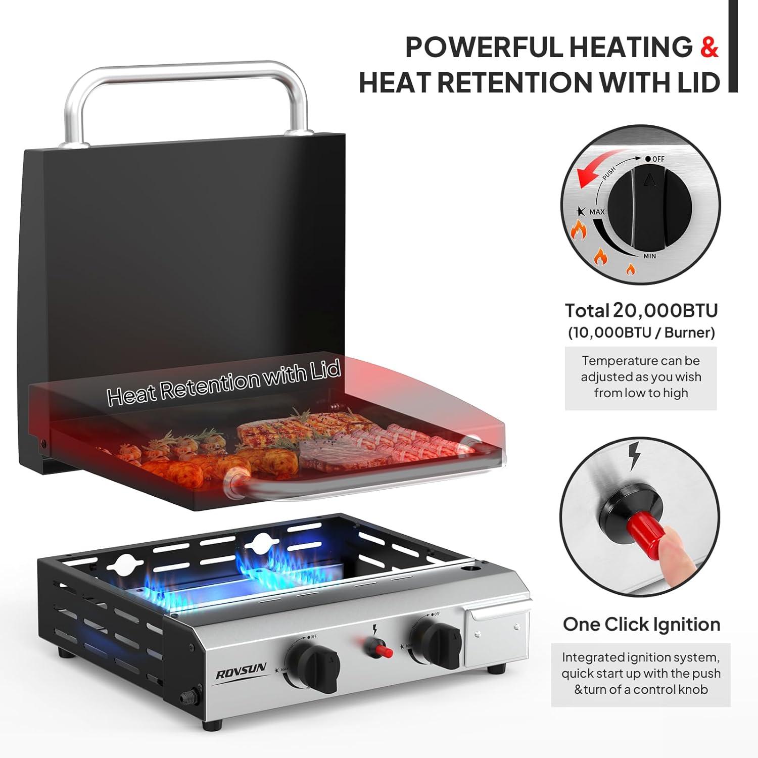 🔥【Powerful Heating】Our product is equipped with 4 independent stainless steel burners, each capable of providing 10,000 BTUs of heat. With both burners in use, you will have 40,000 BTUs of heat that can reach up to 750°F, and you can adjust the flame size as needed, providing a variety of cooking options. Whether it's cooking eggs, pancakes, grilling cheese, or steak, you can do it all with ease