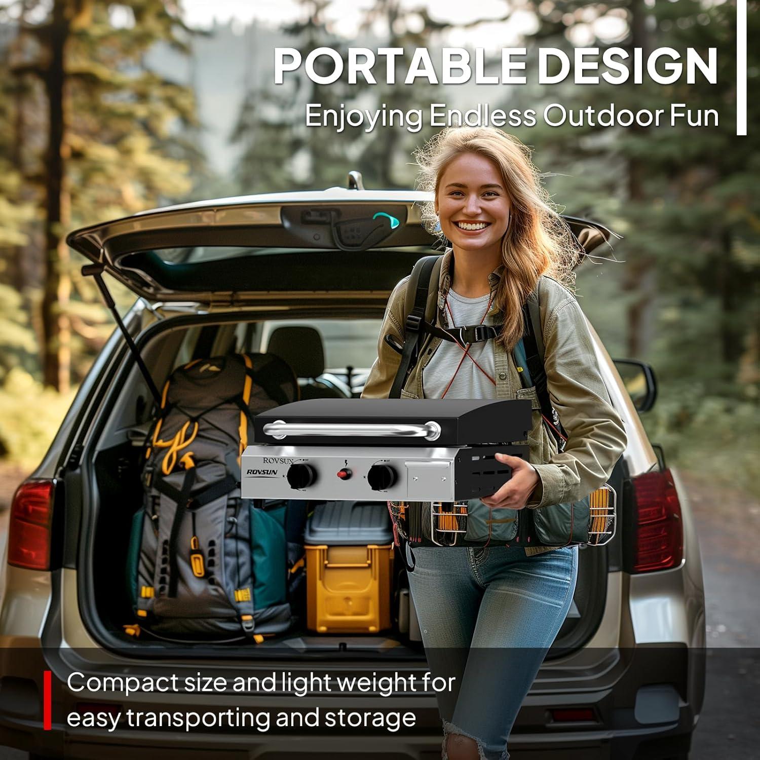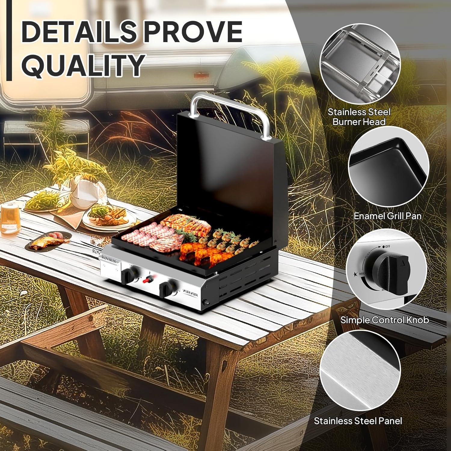 🔥【Powerful Heating】Our product is equipped with 4 independent stainless steel burners, each capable of providing 10,000 BTUs of heat. With both burners in use, you will have 40,000 BTUs of heat that can reach up to 750°F, and you can adjust the flame size as needed, providing a variety of cooking options. Whether it's cooking eggs, pancakes, grilling cheese, or steak, you can do it all with ease