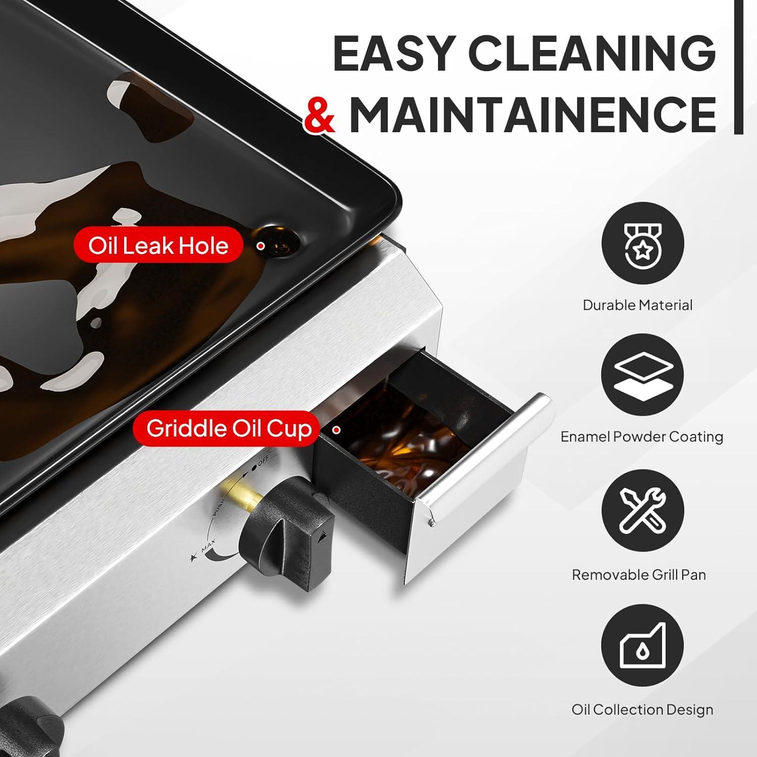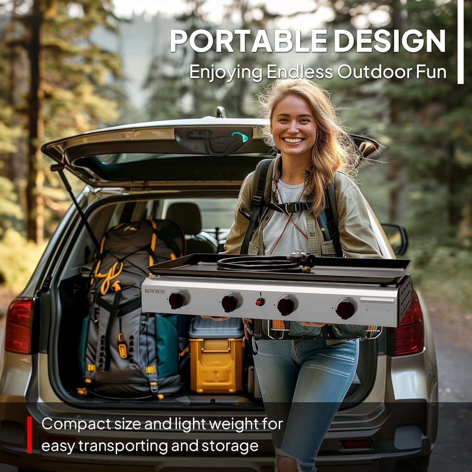 ROVSUN High-quality Porpane Griddle, a perfect companion for all your culinary adventures. Equipped with 4 independent stainless steel burners, it delivers a powerful combined heat of up to 40,000 BTUs. The flame is adjustable, catering to diverse cooking needs. Crafted from robust stainless steel and iron, it promises durability and lasting performance. It features an oil drip tray for easy cleaning post-use and a user-friendly hose and valve connection design, saving you time and money. With a generous cooking area of 426 square inches, including a 30'' × 14.2'' cooking zone, it offers ample space for grilling enthusiasts. It is equipped with two side shelves and a lower shelf rack for added convenience and storage. With built-in wheels, our flat top grill can be easily moved in the yard or outdoors for easy mobility. Whether you're planning outdoor grilling, camping, picnicking, or boating, our griddle is your go-to choice.