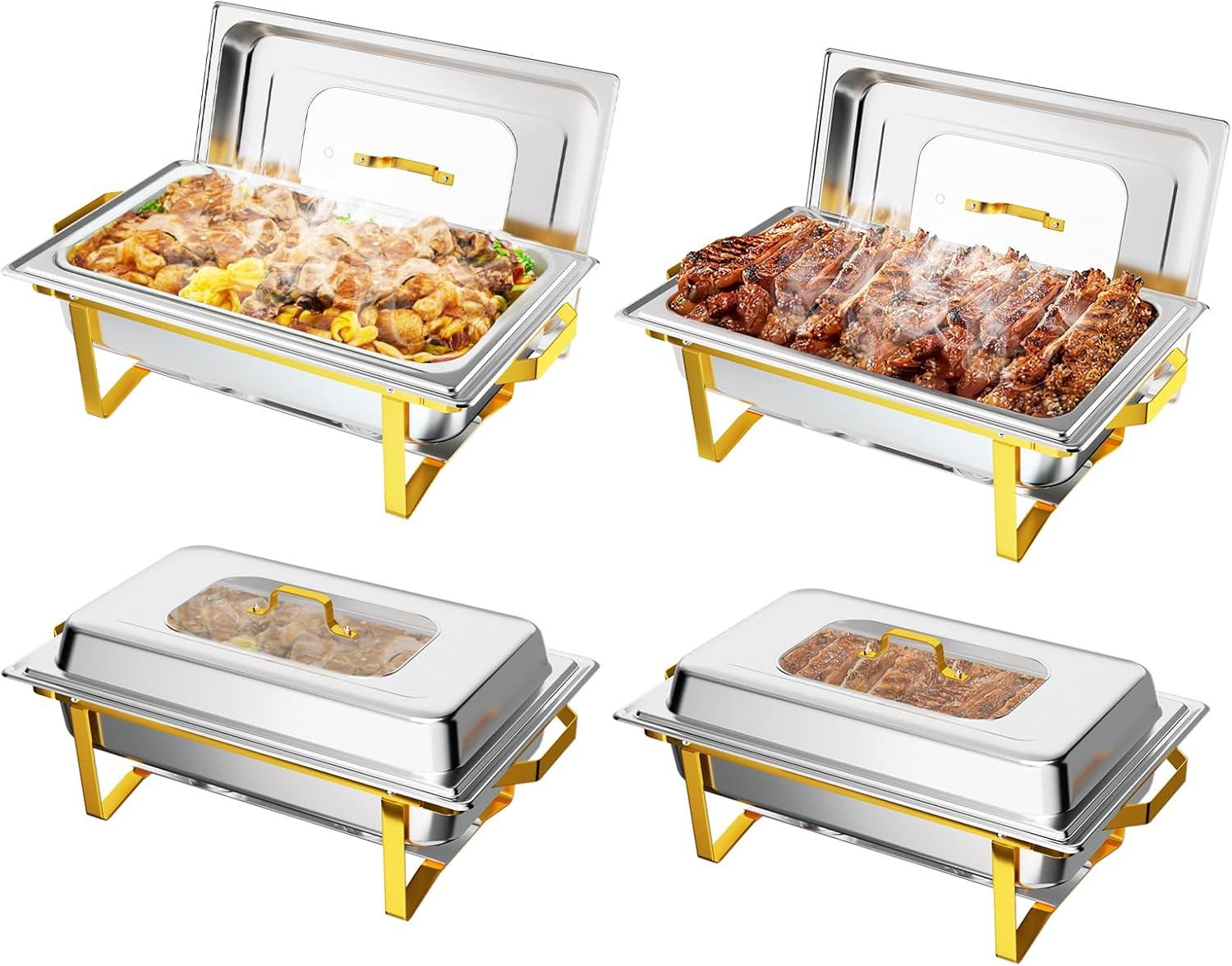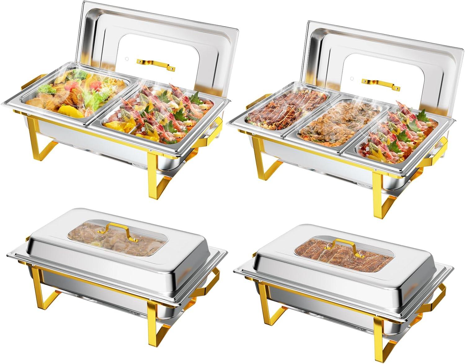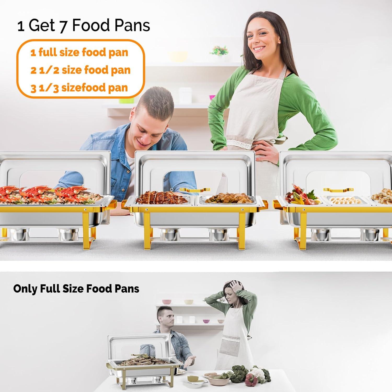 【Multi-Food Pans & Convenient Glass Window 】Our chafing dishes buffet set come with different sizes of food pans. You can freely combine them according to the number of dishes and the number of people. And Comes with a viewing glass window on the lid so you can see your food without opening the lid. This visible design can prevent customers from better choosing their favorite food, without having to open the lid to rummage, and it can better keep warm