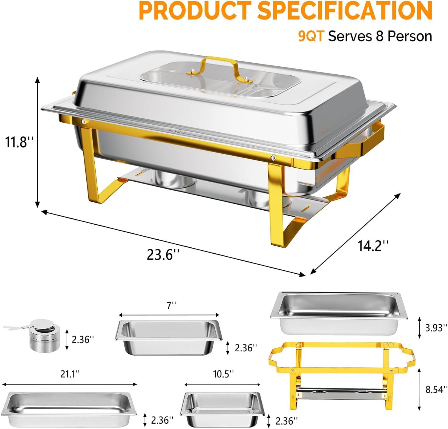 【Food-Grade Stainless Steel】The buffet food warmers sets is made from food-grade stainless steel to ensure the safety and durability of the product.Besides, stainless steel construction is easy for cleaning with dish washing liquid and dried with a soft towel.The food pan, water pan and cover are dishwasher safe.