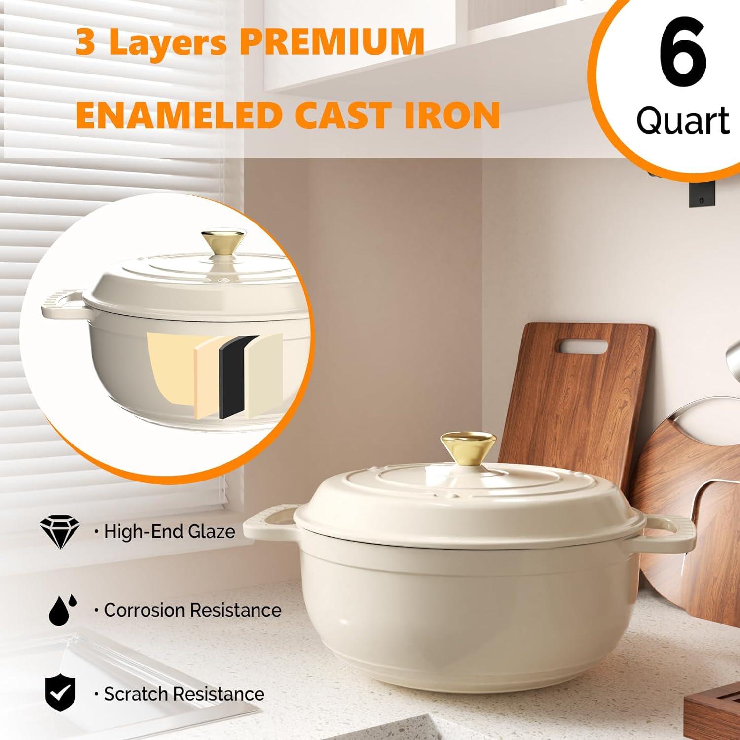 Exceptional Heat Performance: The enameled cast iron dutch oven seamlessly blends robust durability with timeless elegance, making it an ideal choice for marinating, cooking, baking, and serving. Equipped with dual handles for easy handling and an oven-safe temperature range up to 500°F. Its solid, one-piece construction ensures unparalleled durability, guaranteeing a seamless and enjoyable cooking experience every time.