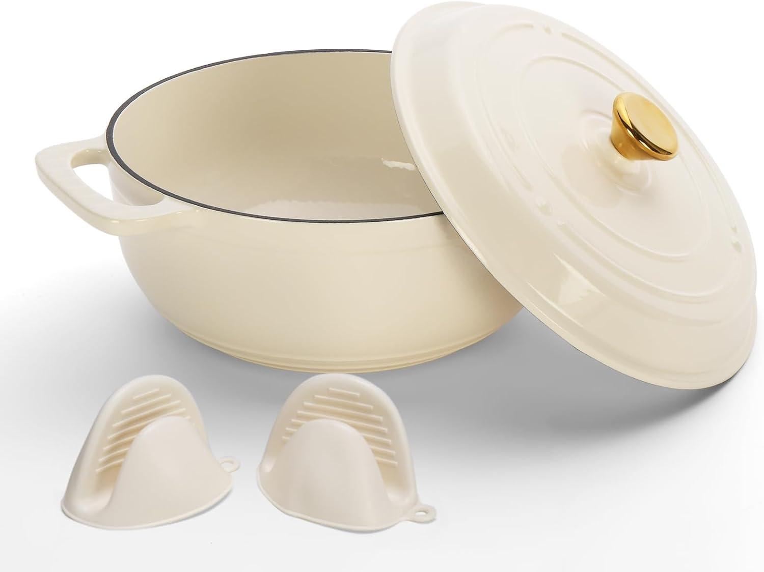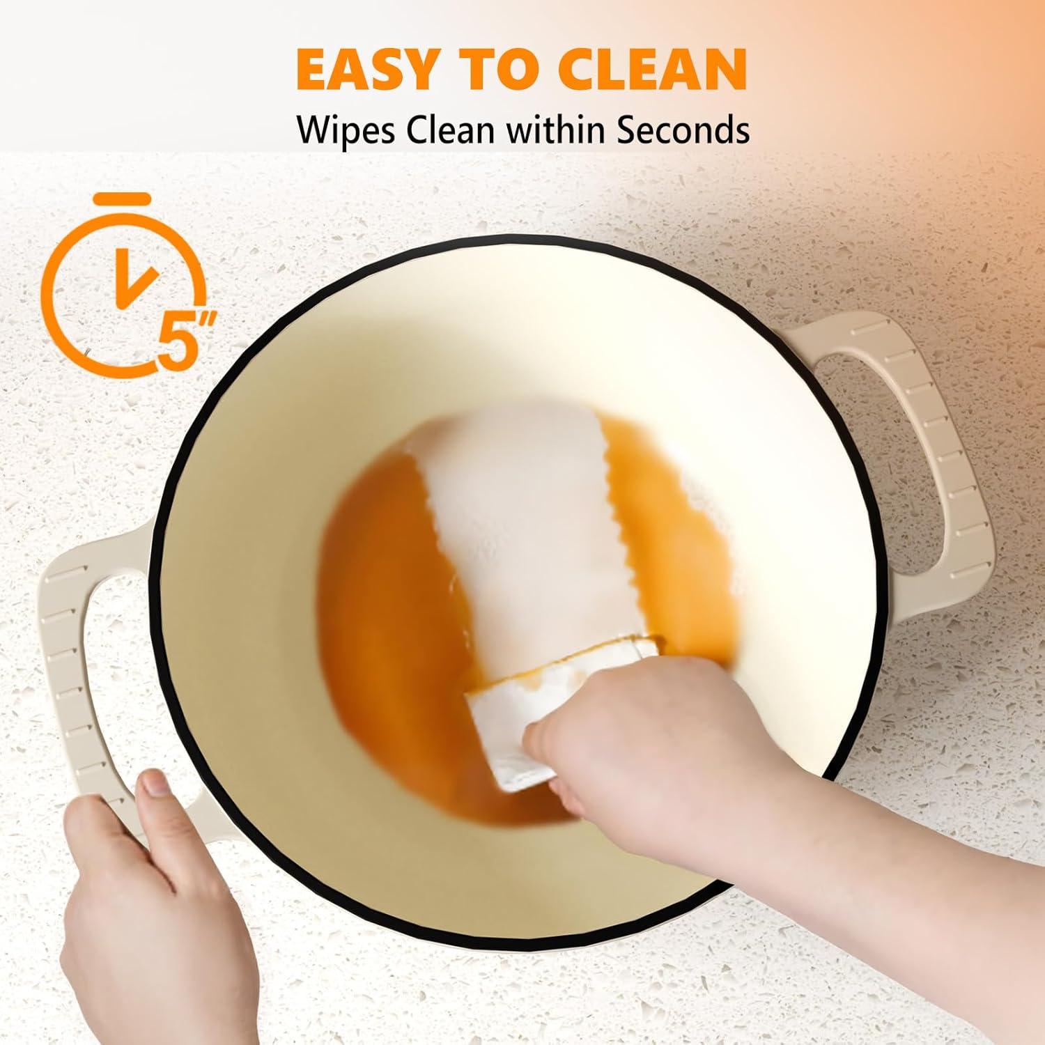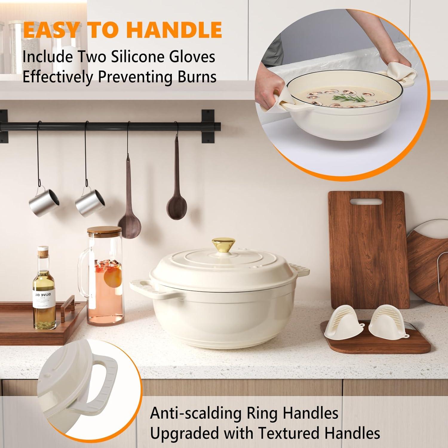 Effortless Cleaning & Safety First: The sleek, flat, and smooth enamel surface of our cast iron dutch oven simplifies cleanup. Food residues are easily wiped away with a gentle stroke of a soft sponge or cloth, making post-meal cleanup a breeze.For added safety, we include a pair of heat-resistant silicone gloves, protecting your hands from burns when handling the pot’s handles and lid.