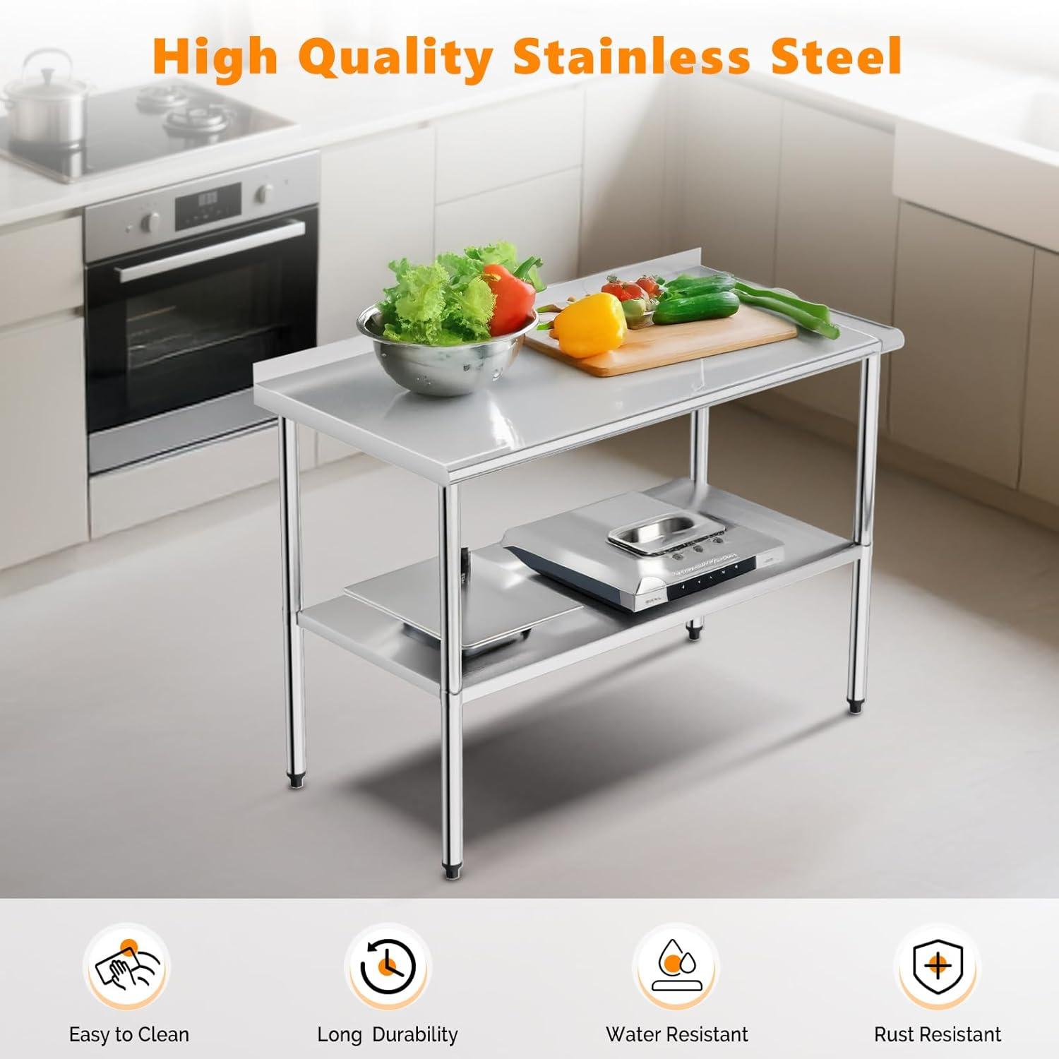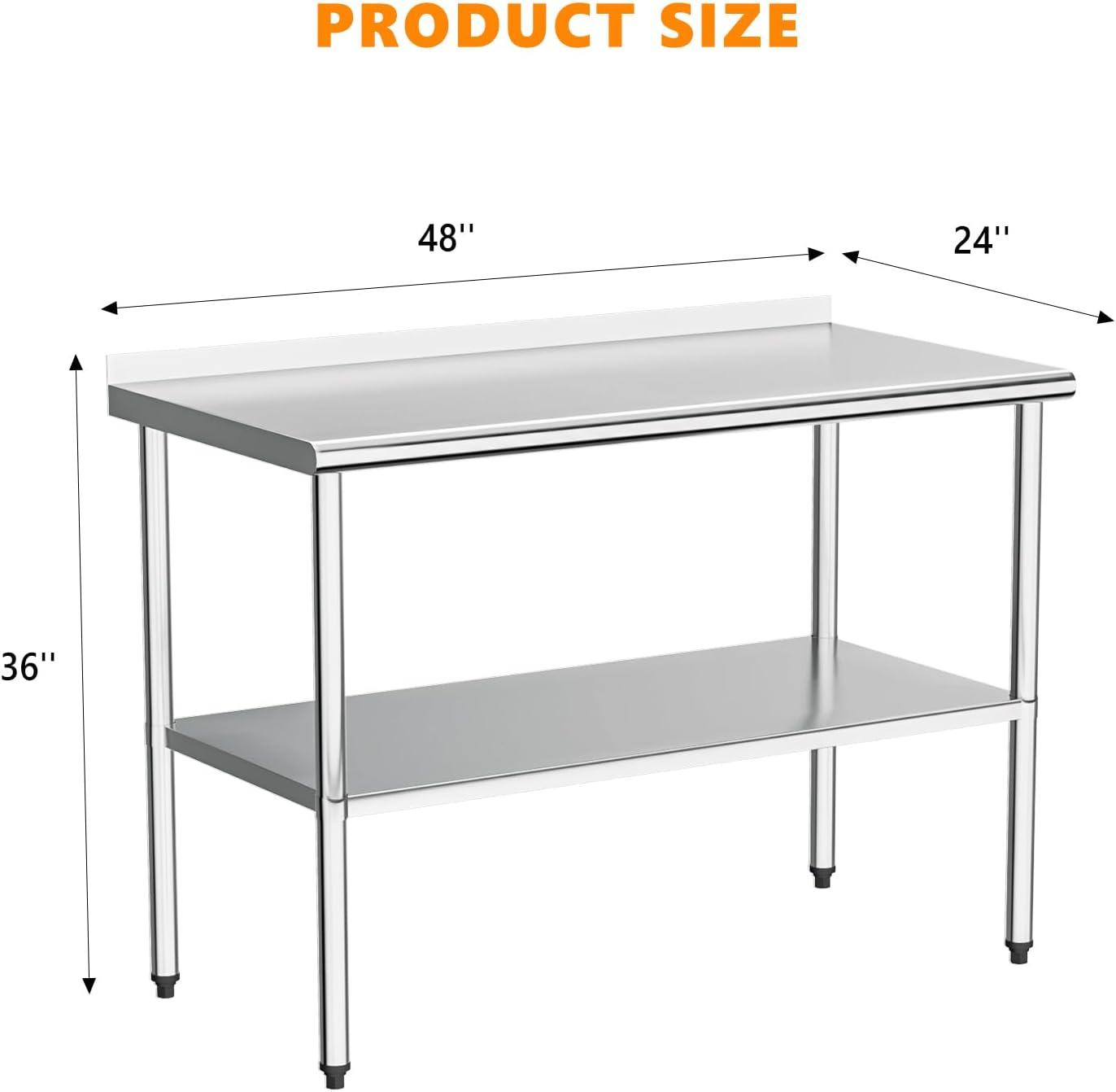ROVSUN 72” x 24” Stainless Steel Table for Prep & Work,Commercial Worktables & Workstations,Heavy Dut Metal Table with Adjustable UnderShelf & Backsplash for Kitchen, Restaurant,Home,Hotel(48”x 24”)