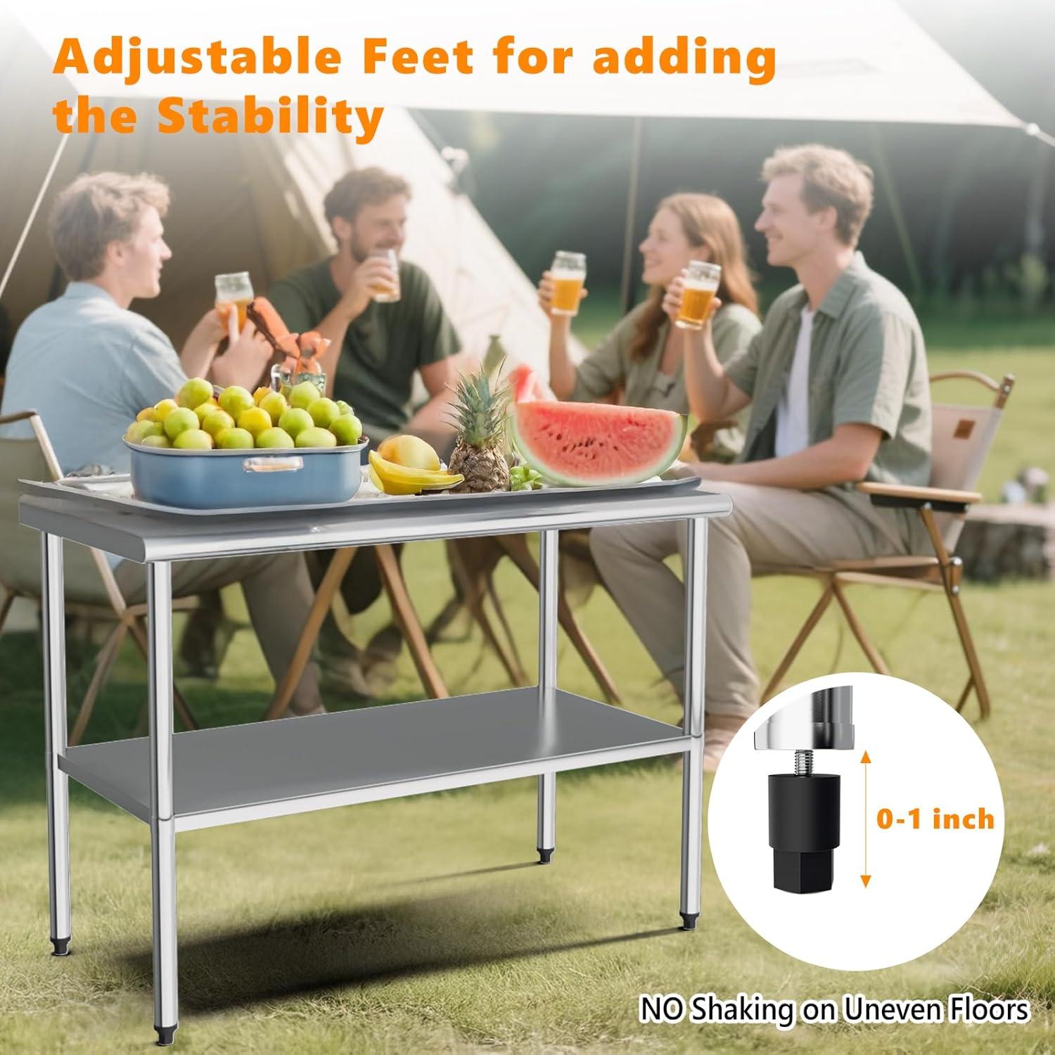 ✔Heavy Duty & Stable Work Table: Designed with solid inner triangle makes our stainless steel prep table very durable and heavy-duty, the all joints are welded expertly for enhanced durability. The upper shelf can bear 330lbs, and its lower shelf can bear 110lbs.And you can also adjust the height of the rubber feet to make the table stable on uneven ground.