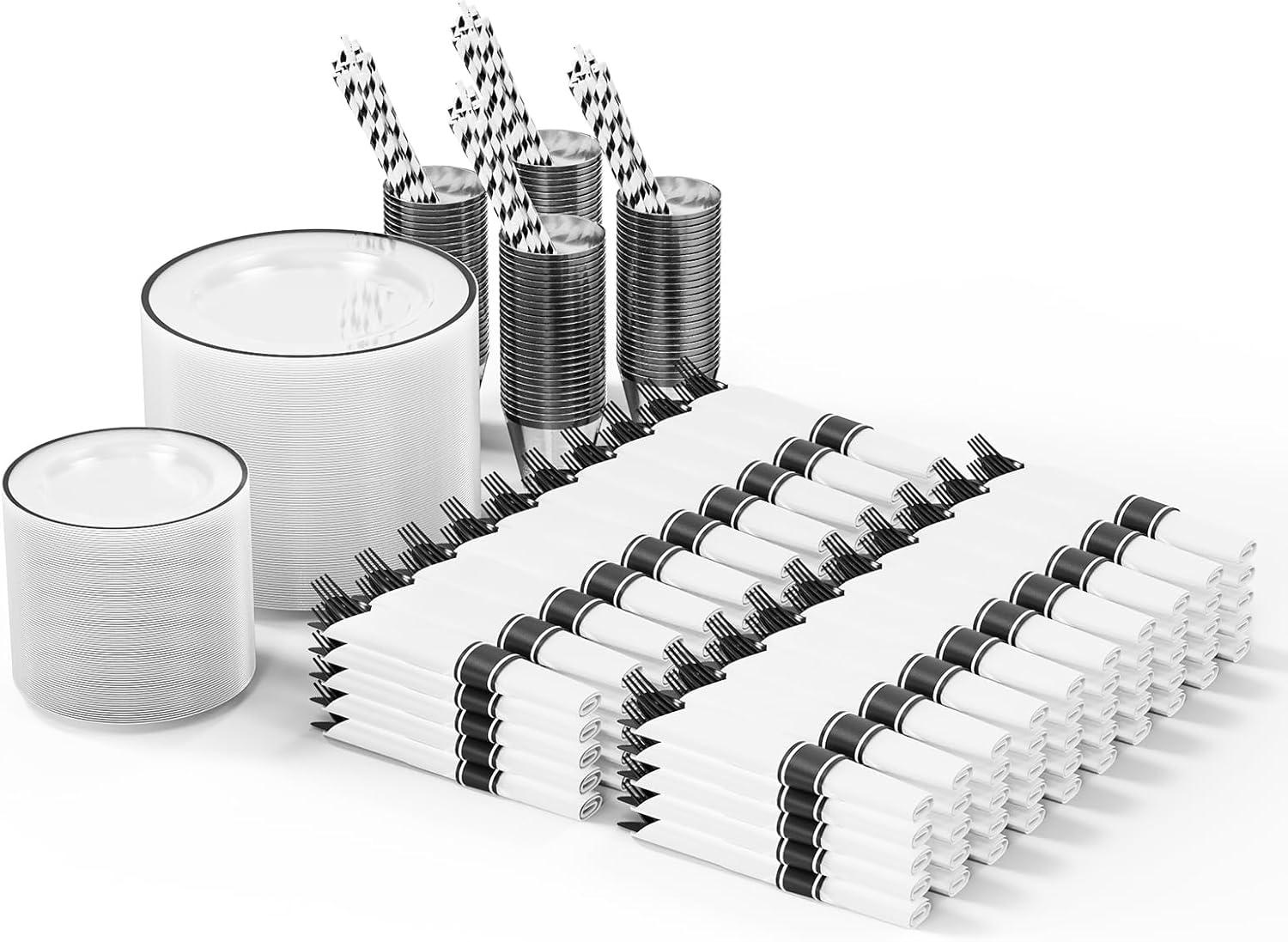 ➤【What's Included】 Enjoy a seamless dining experience with silver disposable plates,including 100 pre-rolled napkins with silverware,100 dinner plates,100 dessert plates,100 cups, 100 straws .