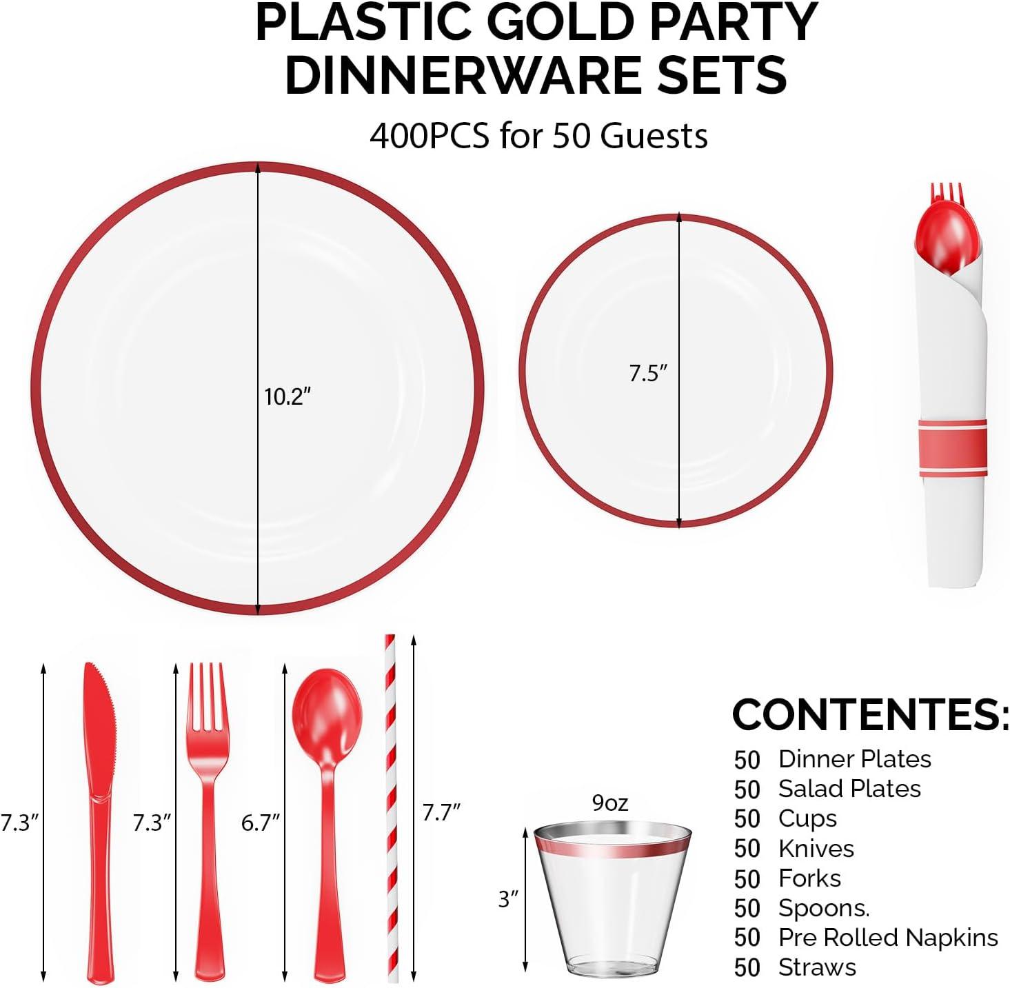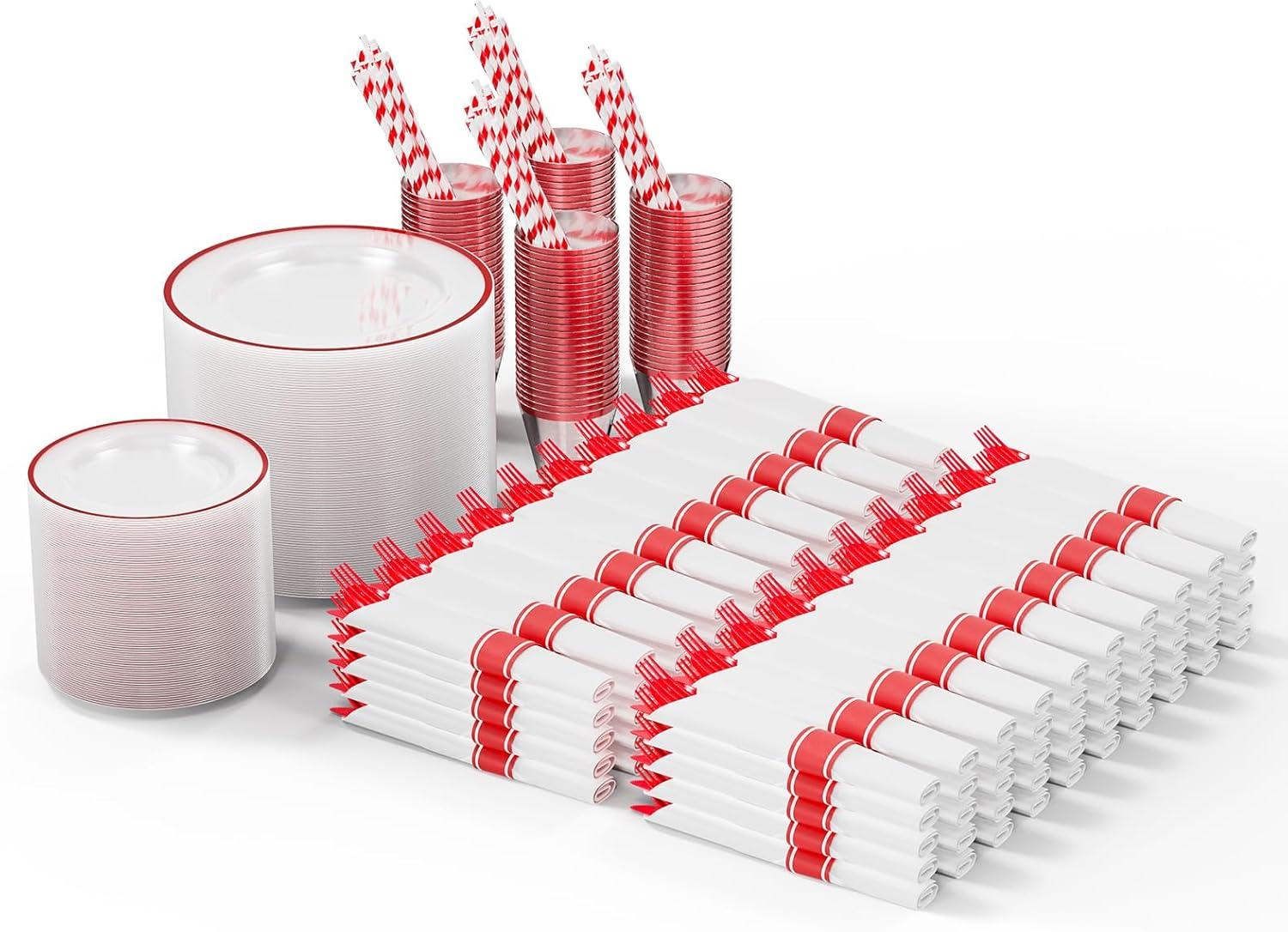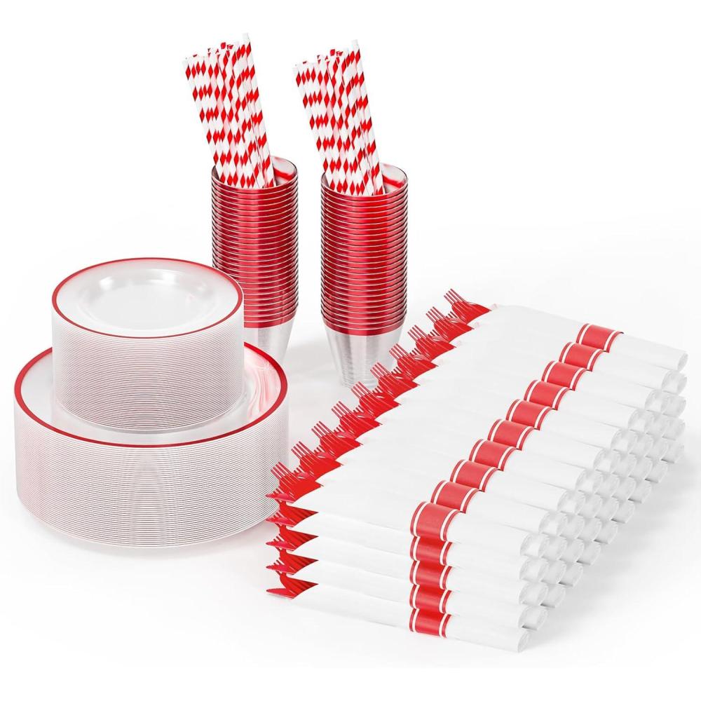 ROVSUN 800-Piece Silver Disposable Dinnerware Set for 100 Guests - Elegant Plastic Plates, Napkins, Silverware, Dessert Plates, Cups, Straws(Red)