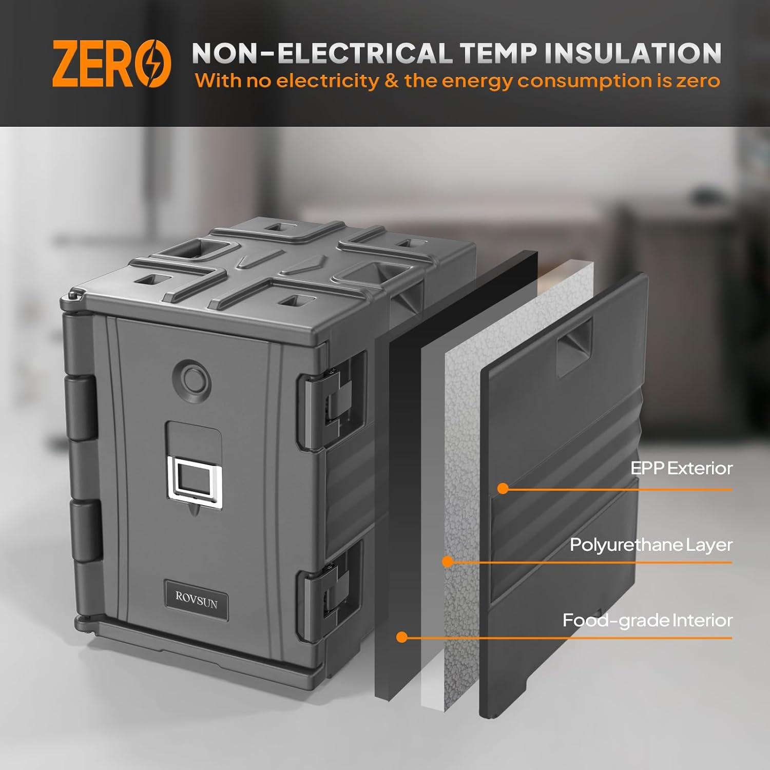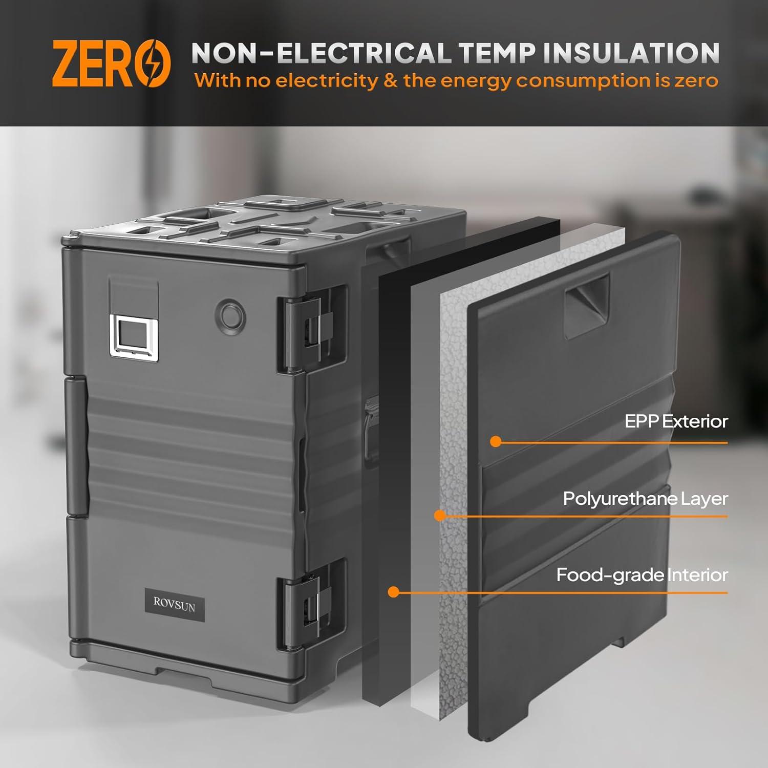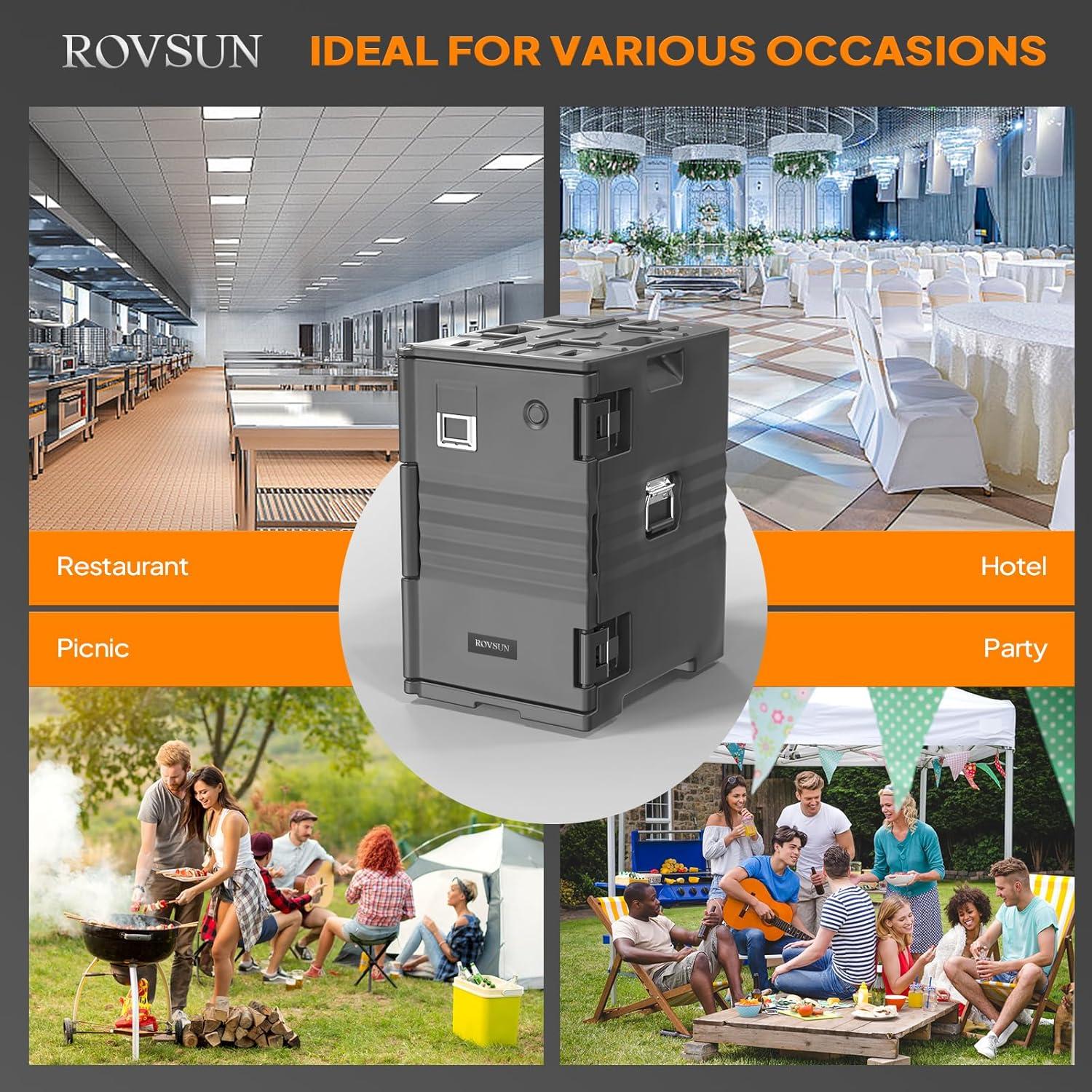 The ROVSUN insulated food pan carrier is perfect for keeping your food hot or cold. Made of dual-layer LLDPE material, our hot box is sturdy and durable for long-time use. Large inner storage space could store a variety of hot and cold dishes. Top built-in handles, four wheels make it easy to transport and move. Top with grooves makes stacking stable and firm for saving space, ideal for catering, picnics, and other events. So what are you waiting for? Just take it home!