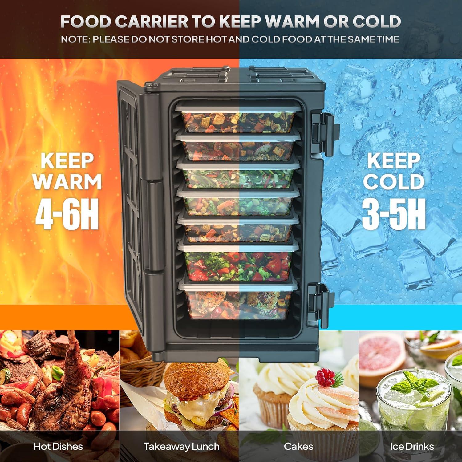 【Large Capacity】 With a large 109 quart capacity, this insulated food pan carrier can hold up to 7 full-size food pans for storing a variety of hot or cold dishes. Multiple intervals allow you to place different sizes of food pans as needed. NOTE: Food pans are not included. Plus, for storage convenience and space-saving, this pan carrier can be stacked