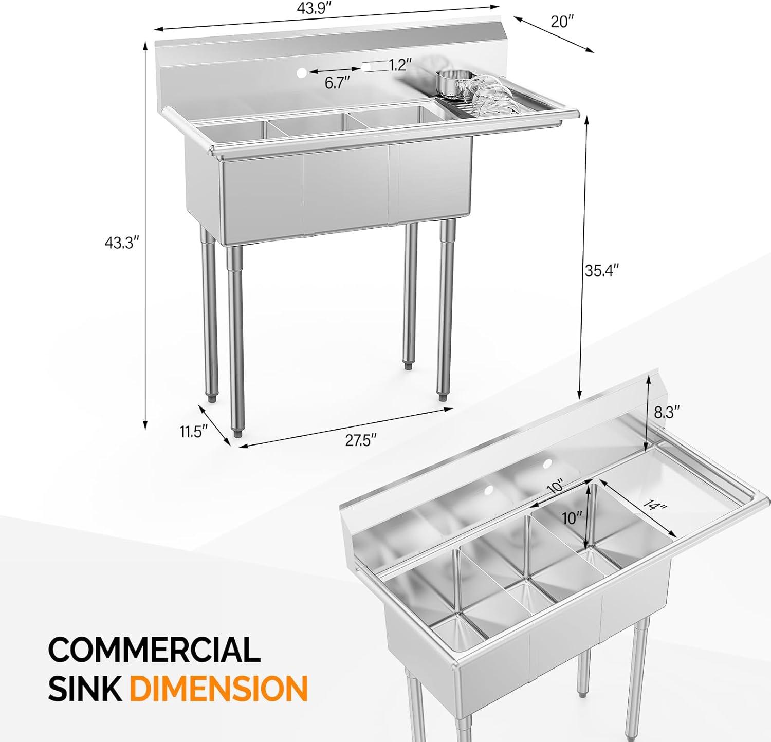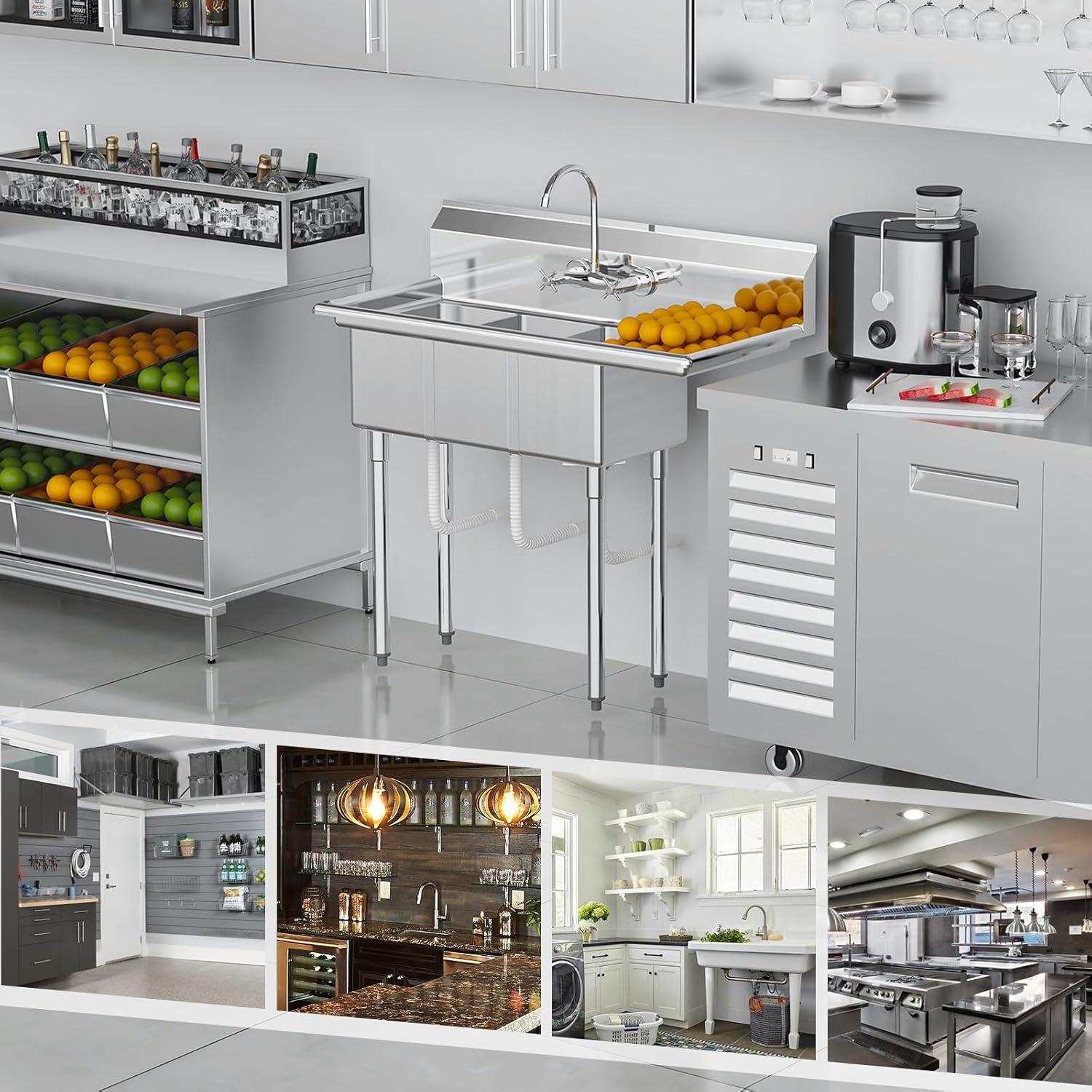 【High-quality Stainless Steel】: Made of high-quality stainless steel, this sink is rust-resistant and corrosion-resistant, ensuring durability in the fast-paced commercial kitchen environment. Stainless steel surface smooth, easy to clean.