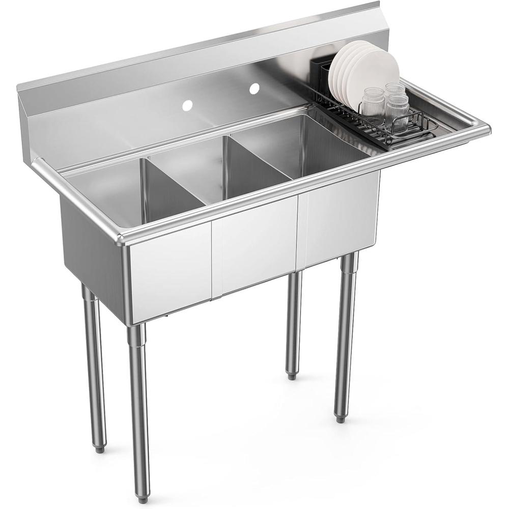 imageROVSUN Commercial Sink Stainless Steel Sink with 3 Compartment and 2 Sides Drain Rack 20quot x 54quot x 435quot Freestanding Utility Sink Great for Restaurant Kitchen Laundry Room Garage SunroomRight Drainboard