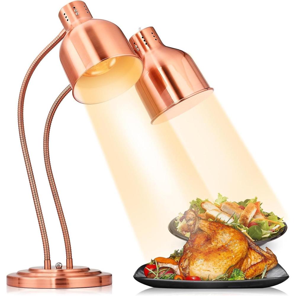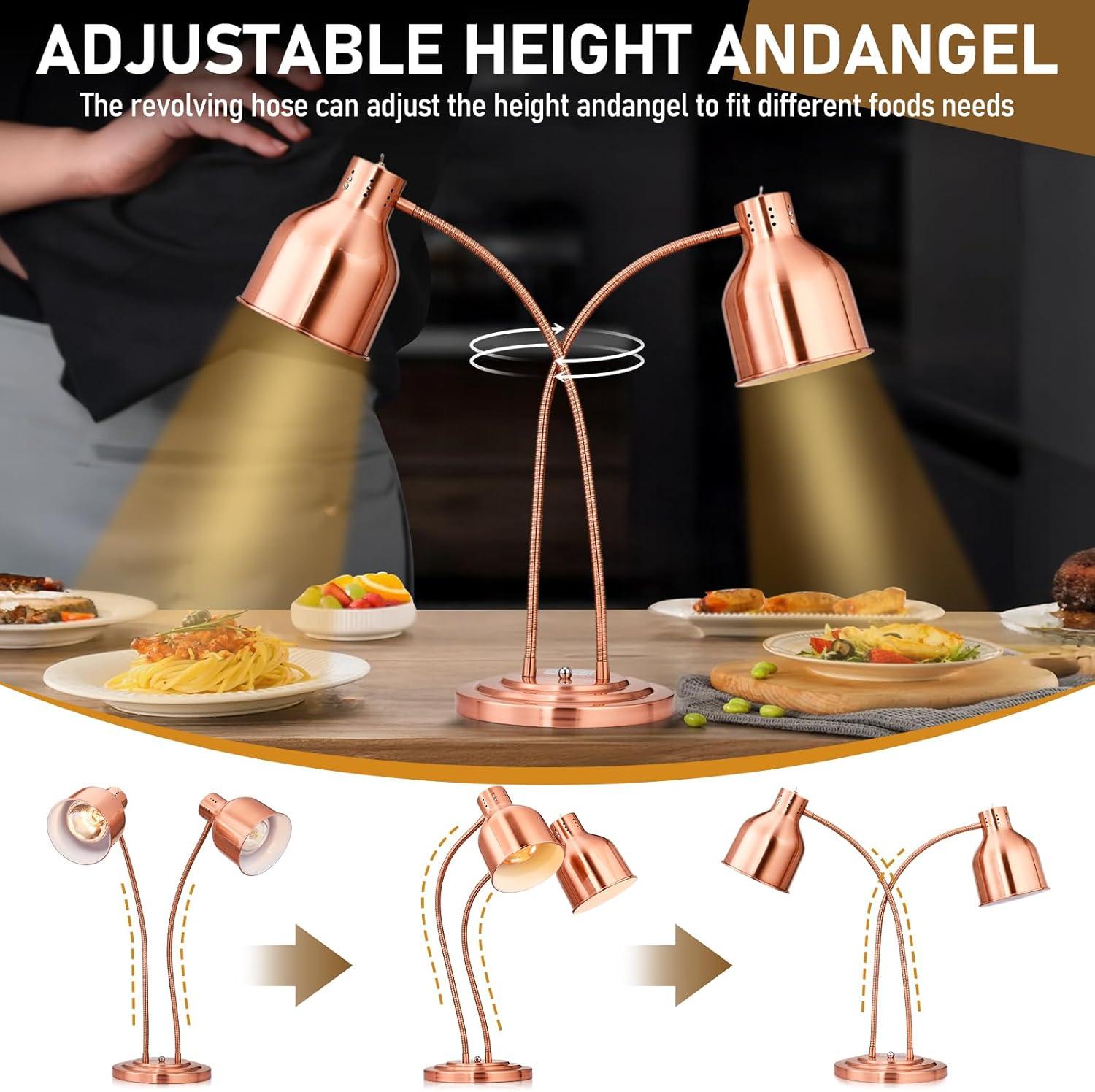 This premium food warming lamp delivers efficient heating and flexible control for superior food presentation. Equipped with dual 250W high-power rapid-heating bulbs, it provides fast, even and long-lasting warmth to maintain ideal serving temperature – ensuring perfect taste and texture every time.The 360° swivel design allows precise directional control of heat and light, while adjustable height settings enable perfect temperature management for any dish. Operate bulbs independently – use single bulb for energy-saving focused heating or both bulbs for maximum warming capacity, adapting effortlessly to different needs.Featuring a premium coated shade that resists fingerprints and grease stains – simply wipe clean with ease. An indispensable kitchen companion for any setting, it guarantees consistently delicious results wherever you serve.