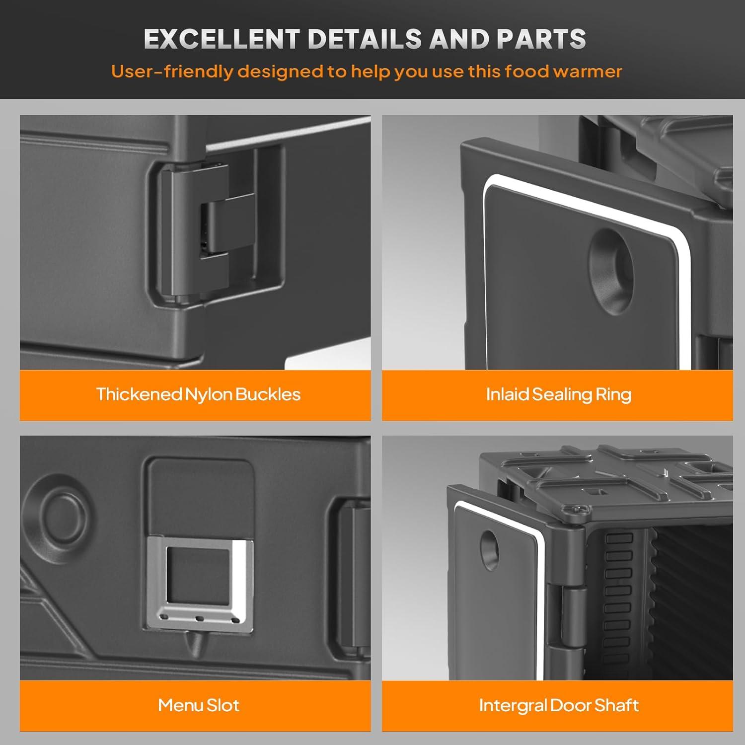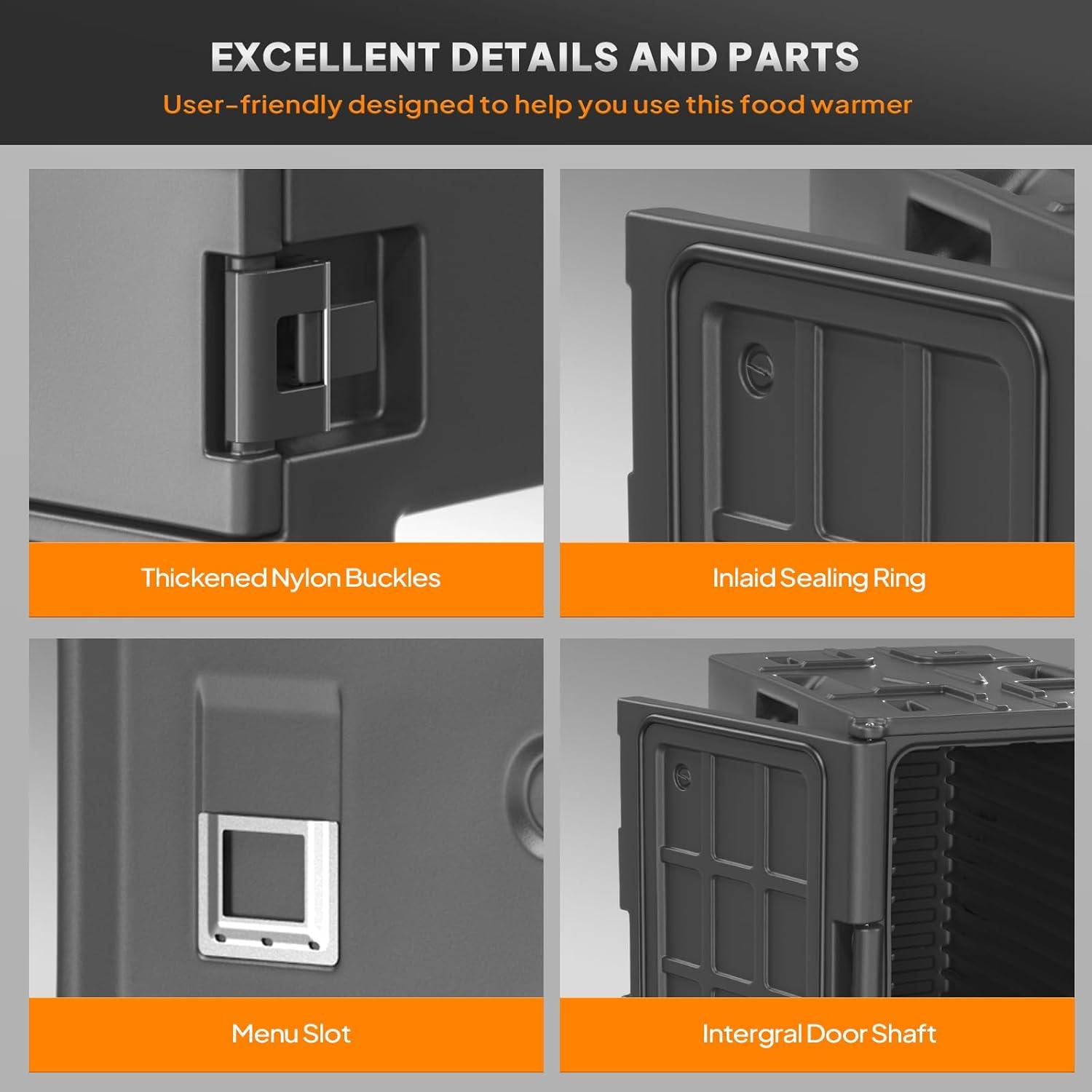 【Easy Mobility】 Equipped with 4 casters (2 with brakes) and two built-in top handles, this hot box can be easily transported to your desired location, saving labor and providing convenience. The door could be opened up to 270 degrees, allowing easy loading and unloading of food pans