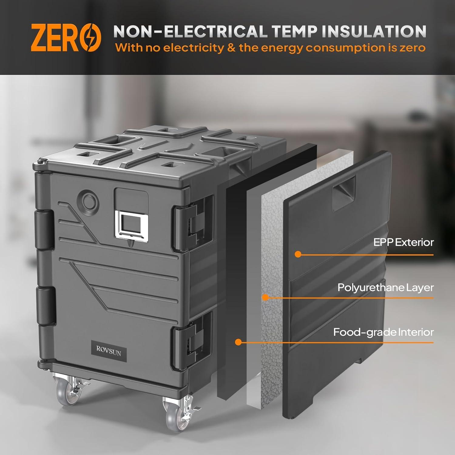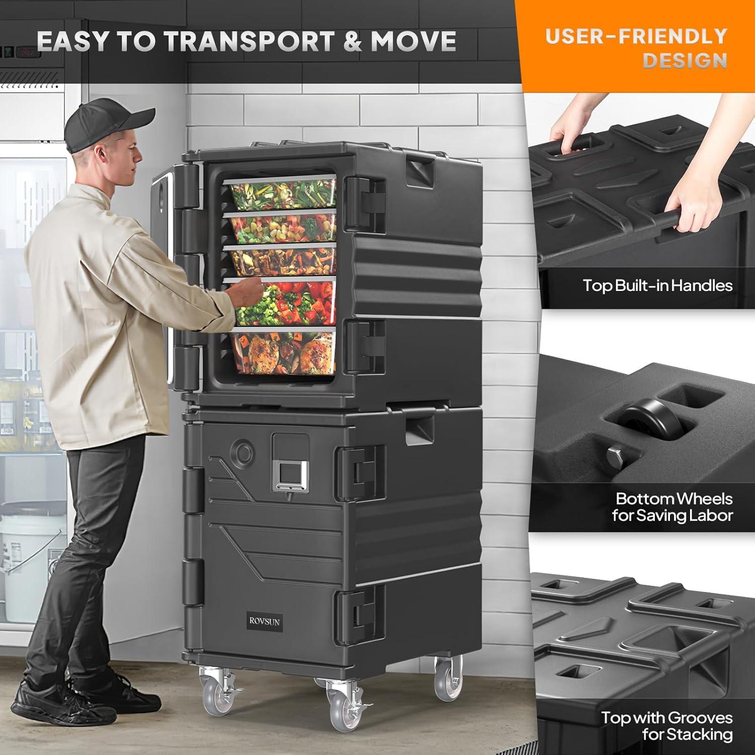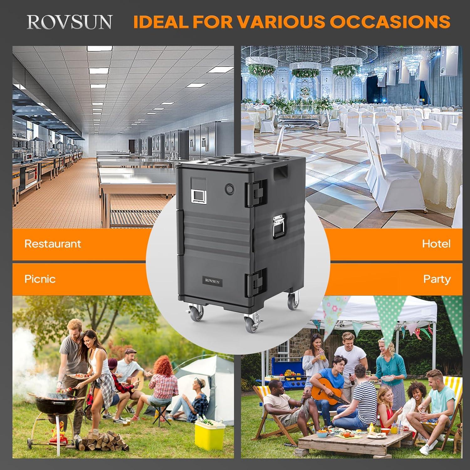 The ROVSUN insulated food pan carrier is perfect for keeping your food hot or cold. Made of dual-layer LLDPE material, our hot box is sturdy and durable for long-time use. Large inner storage space could store a variety of hot and cold dishes. Top built-in handles, four wheels make it easy to transport and move. Top with grooves makes stacking stable and firm for saving space, ideal for catering, picnics, and other events. So what are you waiting for? Just take it home!