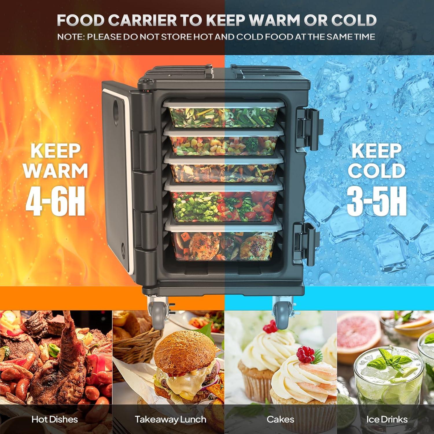 【Large Capacity】 With a large 109 quart capacity, this insulated food pan carrier can hold up to 7 full-size food pans for storing a variety of hot or cold dishes. Multiple intervals allow you to place different sizes of food pans as needed. NOTE: Food pans are not included. Plus, for storage convenience and space-saving, this pan carrier can be stacked