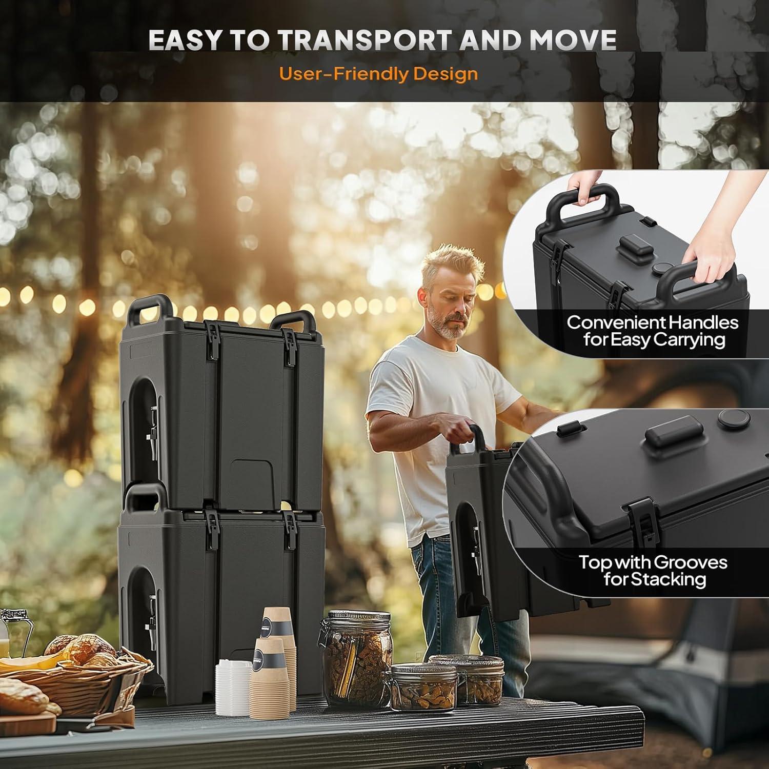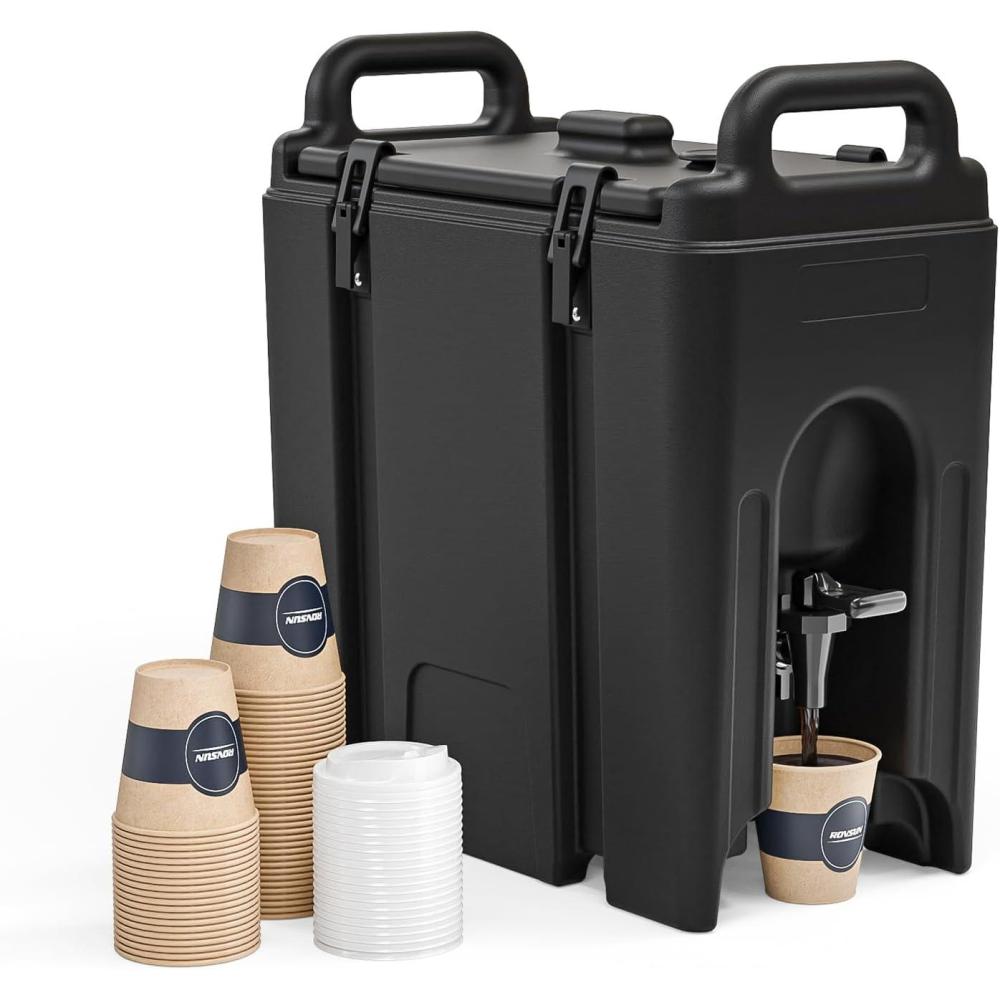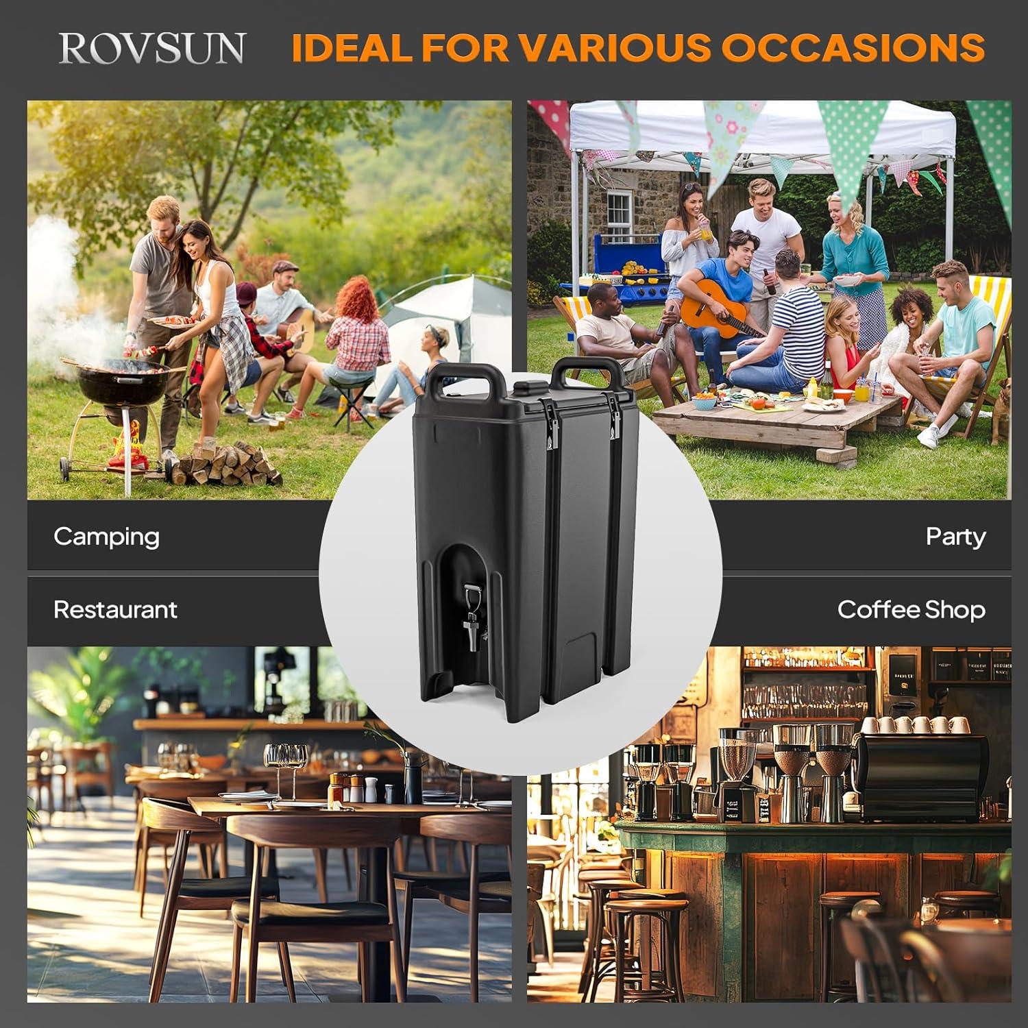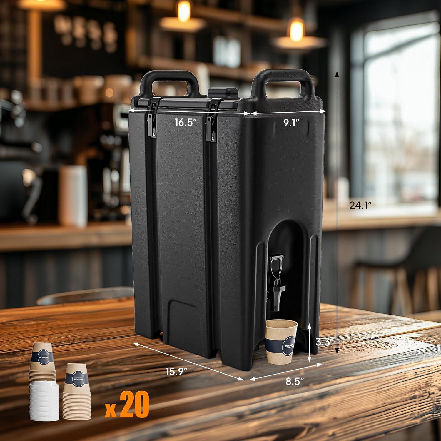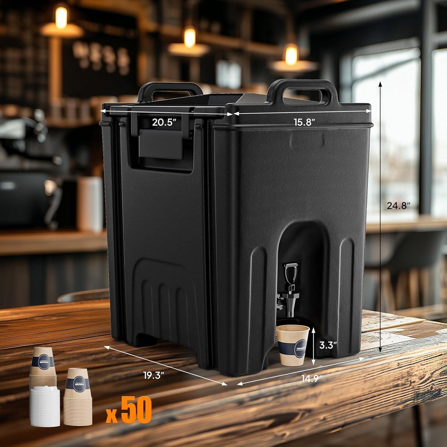 【Versatile Application & Portability】 Despite its large capacity, the dispenser remains portable with built-in handles and a manageable weight. Perfect for catering services, camping trips, coffee shops, bars or office gatherings. The sleek design complements any setting while maintaining optimal beverage temperature