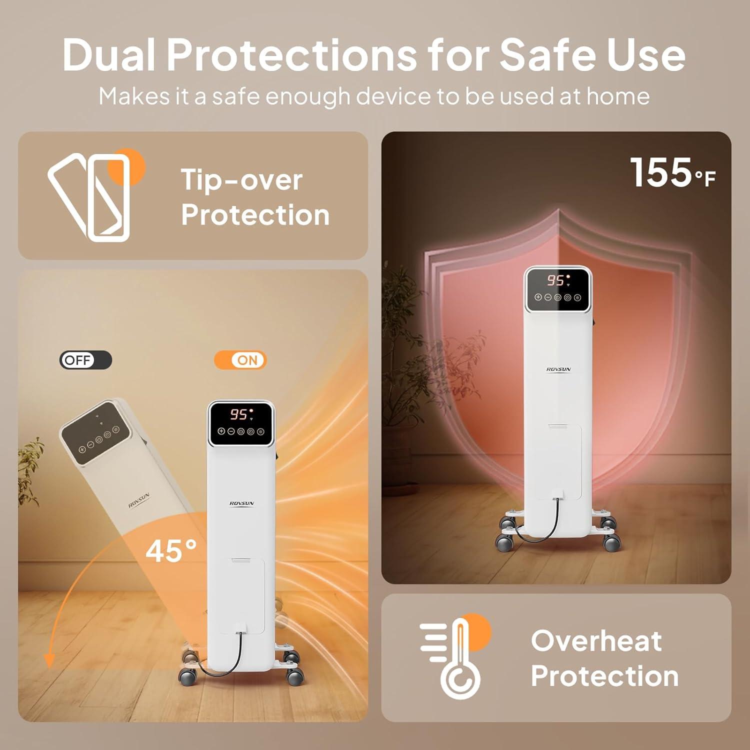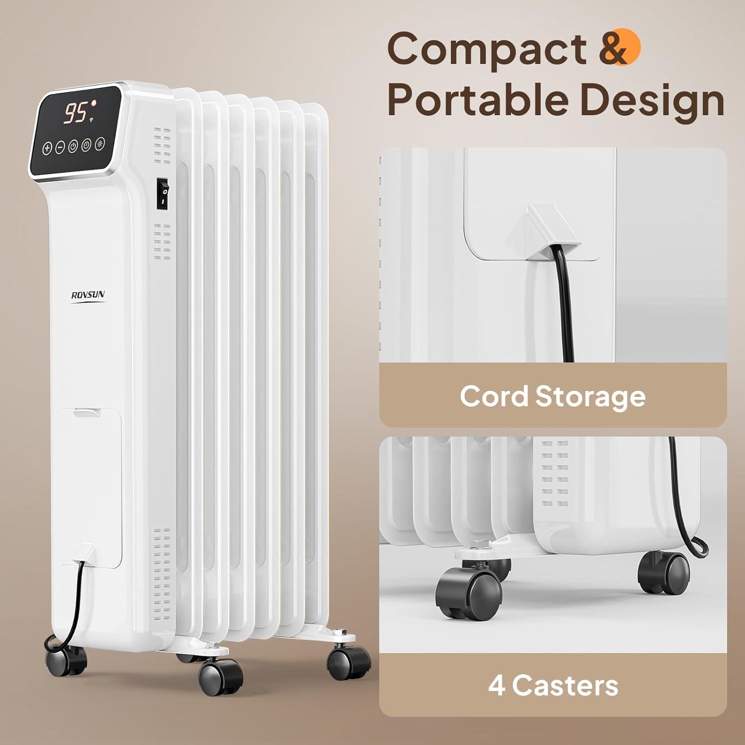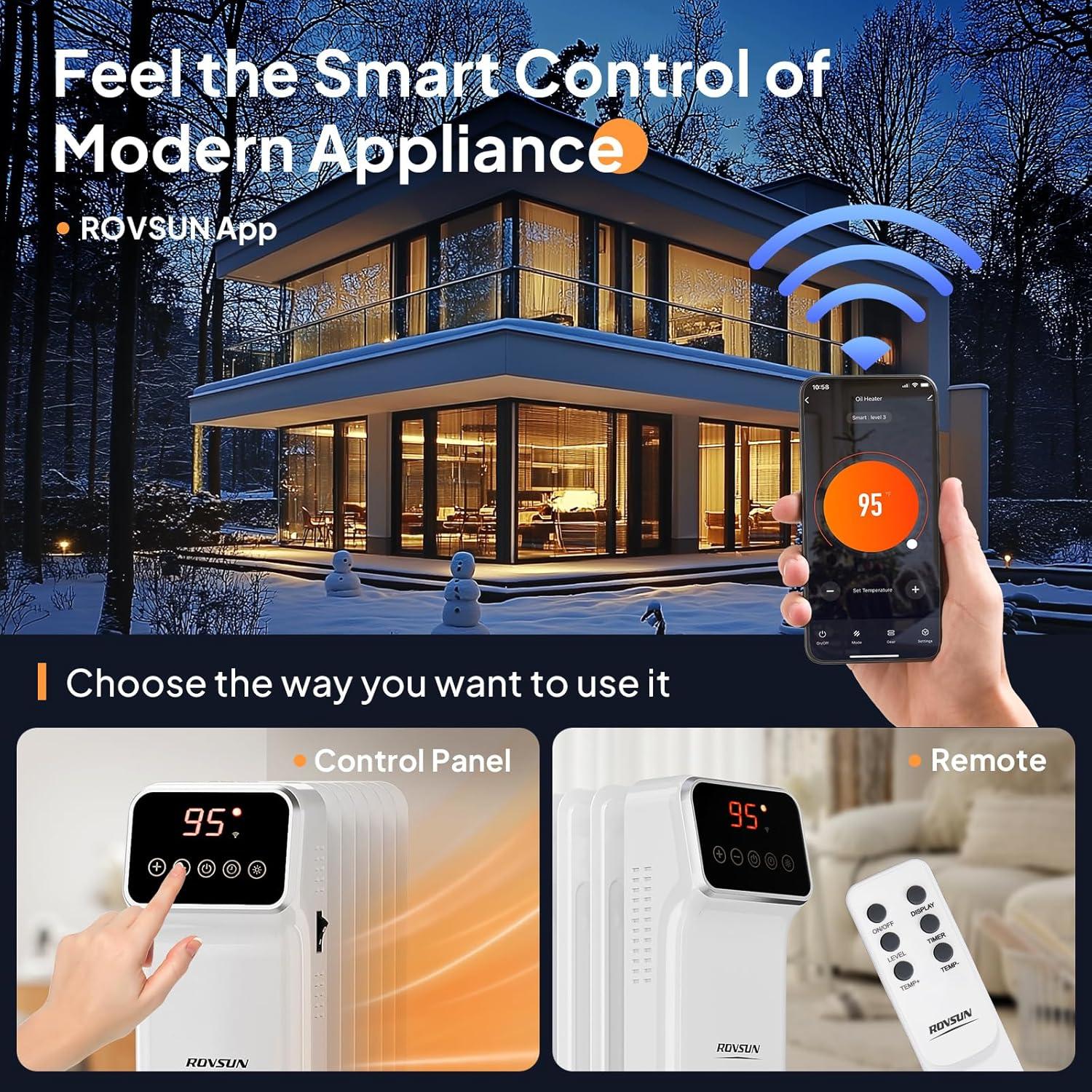 ROVSUN Oil-Filled Radiant Radiator, 1500W Oil Heater w/Adjustable Thermostat, Remote & APP Control, Energy Efficient Space Heater, Tip-Over & Overheat Protection for Indoor Use, Home, Office, Balck(White)