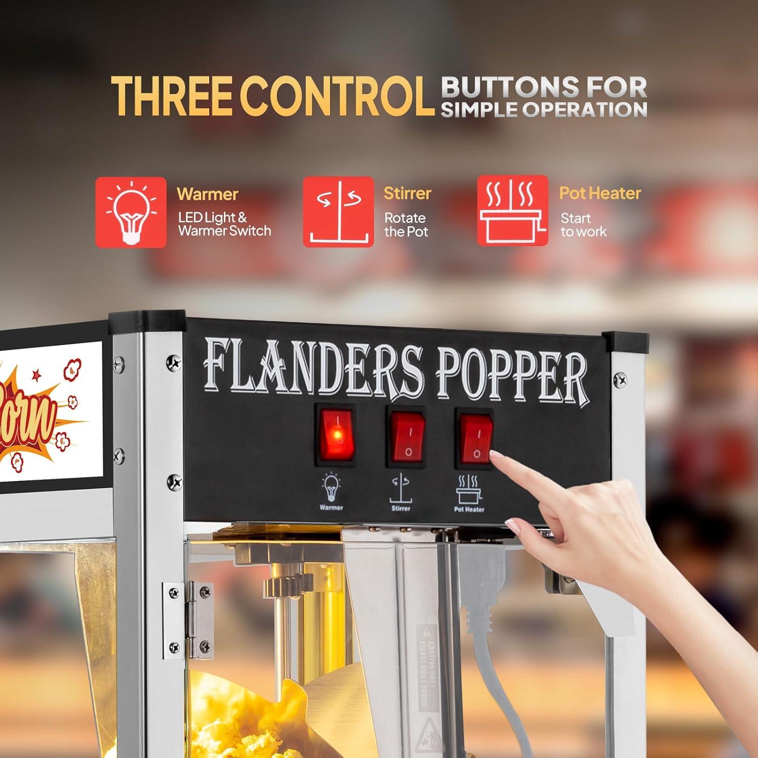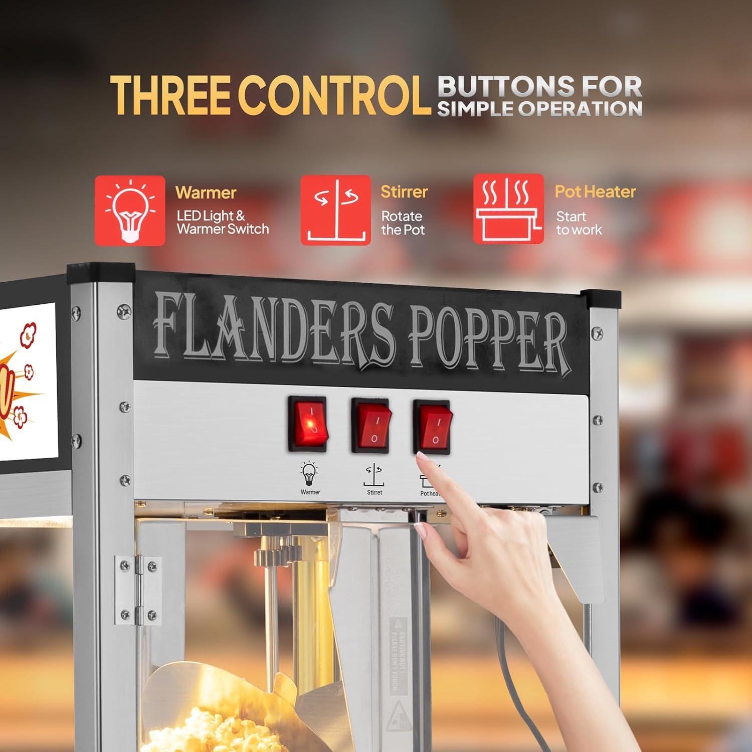 ✔ 3 Control Switches: The countertop popcorn maker machine is designed with 3 control switches for controlling the warmer, stirrer, pot heater separately, which makes the operation more convenient. Besides, it is designed with an interior LED light for providing a clear view and also creating a movie theater atmosphere