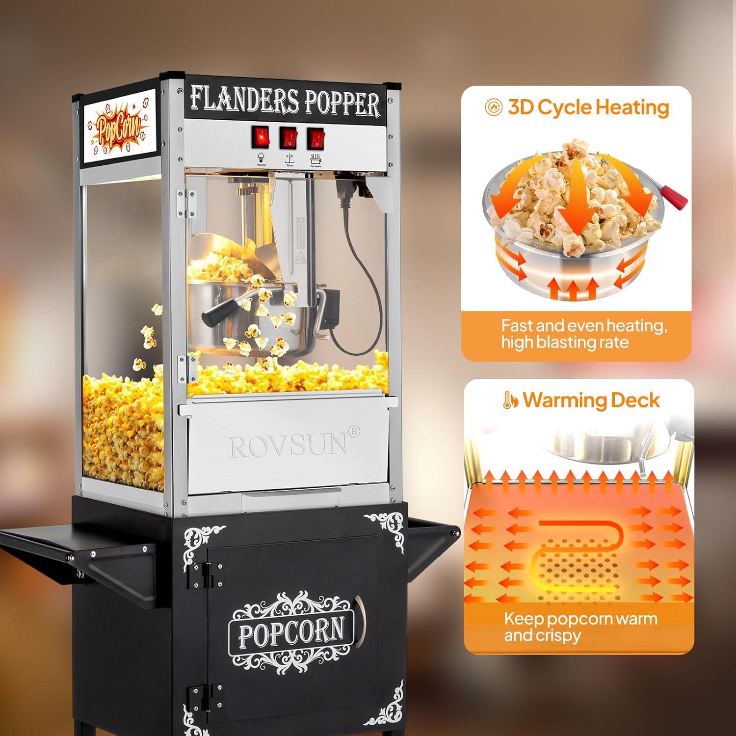 ✔ Wheels for Mobility: The popcorn machine comes with a cart with 2 wheels for easy mobility. What’s more, the cart is designed with a storage compartment for storing accessories and other small items needed for making popcorn