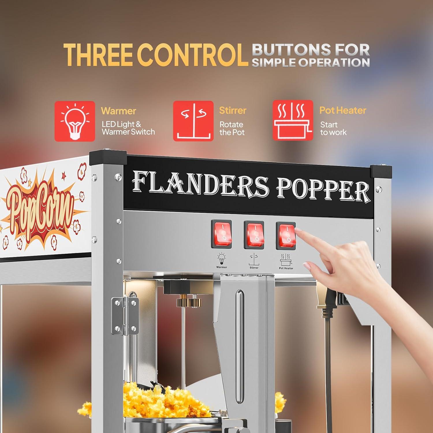 3 CONTROL SWITCHES: The popcorn maker machine is designed with 3 control switches for controlling the warmer, stirrer, pot heater separately, which makes the operation more convenient. Besides, it is designed with an interior LED light for providing a clear view and also creating a movie theater atmosphere