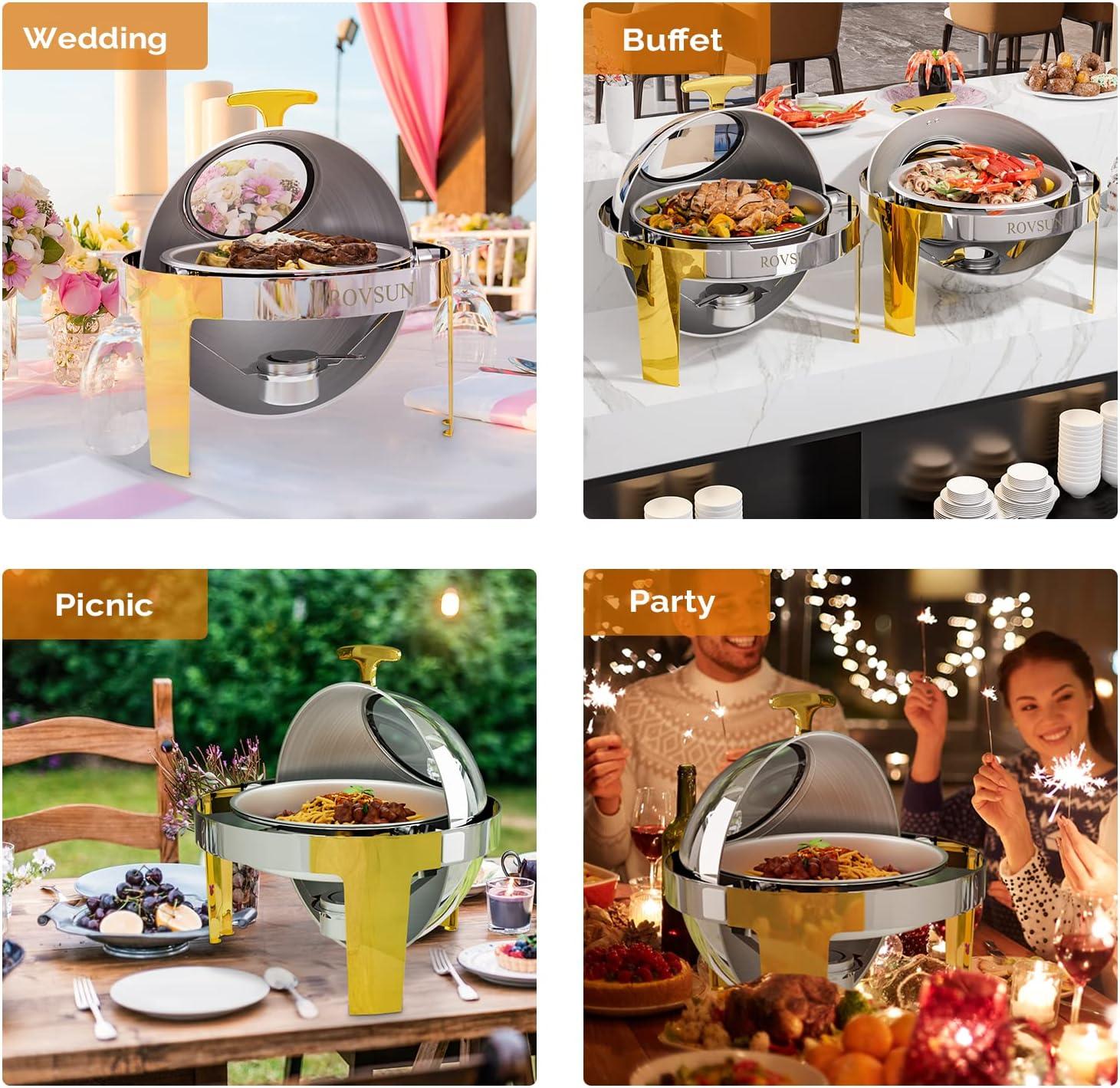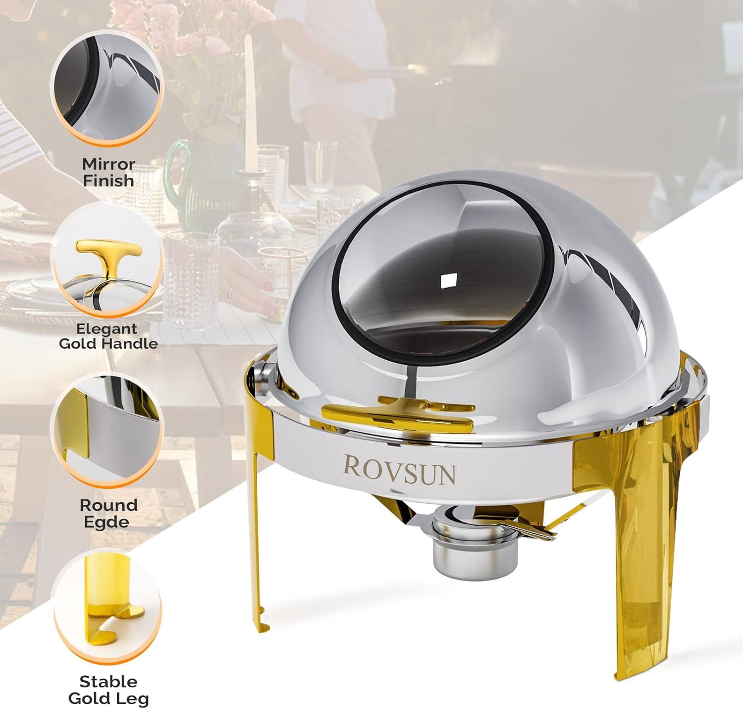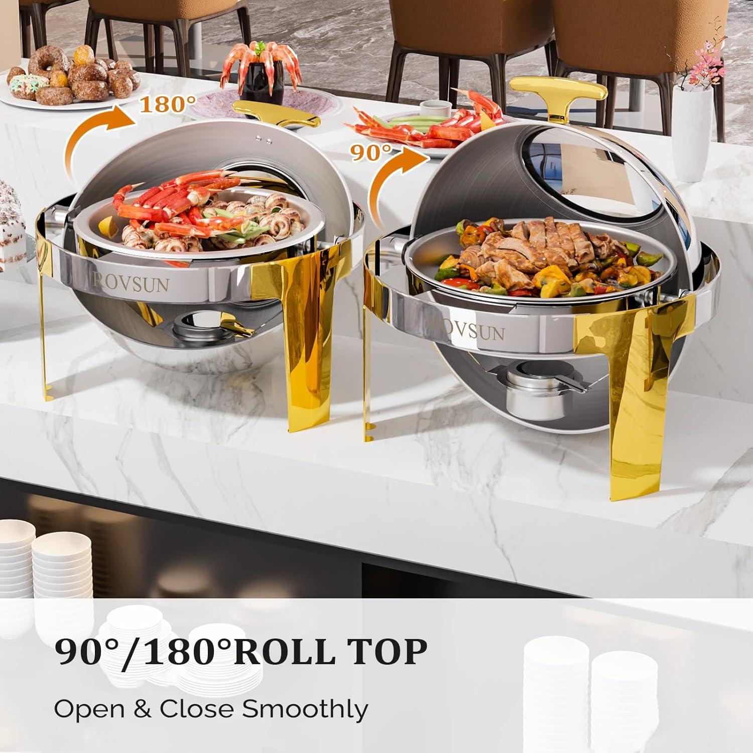 ROVSUN Roll Top Chafing Dishes for Buffet 6QT, Stainless Steel Round Chafing Dish Buffet Set, Buffet Servers and Warmers Set with Glass Window for Weddings Parties Catering Events, Gold(2 Pack)