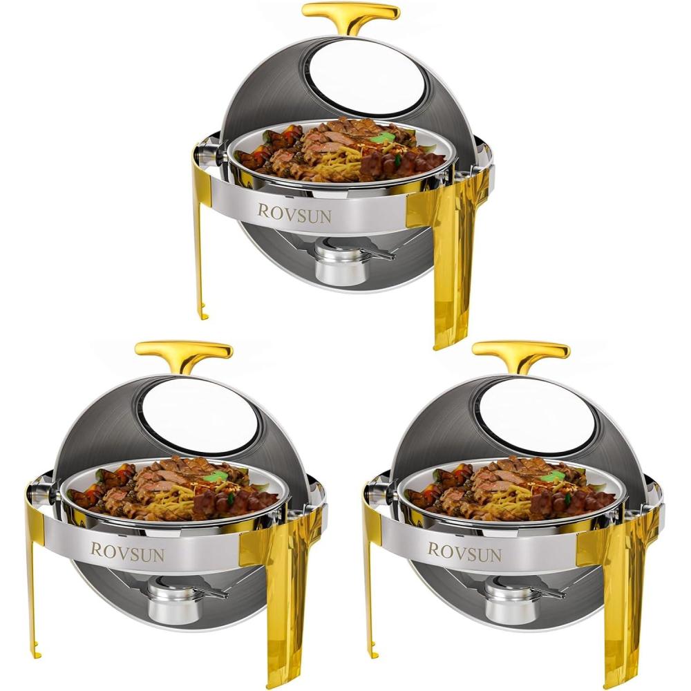 ROVSUN Roll Top Chafing Dishes for Buffet 6QT, Stainless Steel Round Chafing Dish Buffet Set, Buffet Servers and Warmers Set with Glass Window for Weddings Parties Catering Events, Gold(3 Pack)