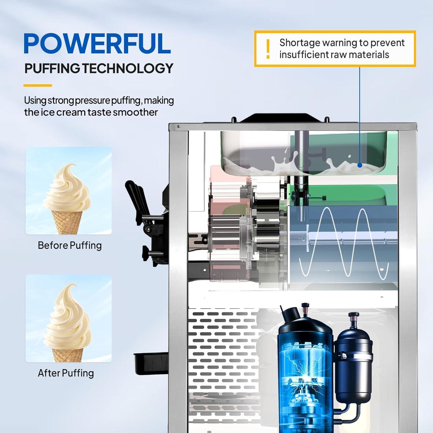 【Puffing Function】Equipped with puffing function, our soft ice cream machine helps to ensure that your ice cream is perfectly smooth and creamy. With this function, you can produce ice cream that is comparable to high-end ice cream shops, making it a great choice for those who want to offer their families and customers the best possible product