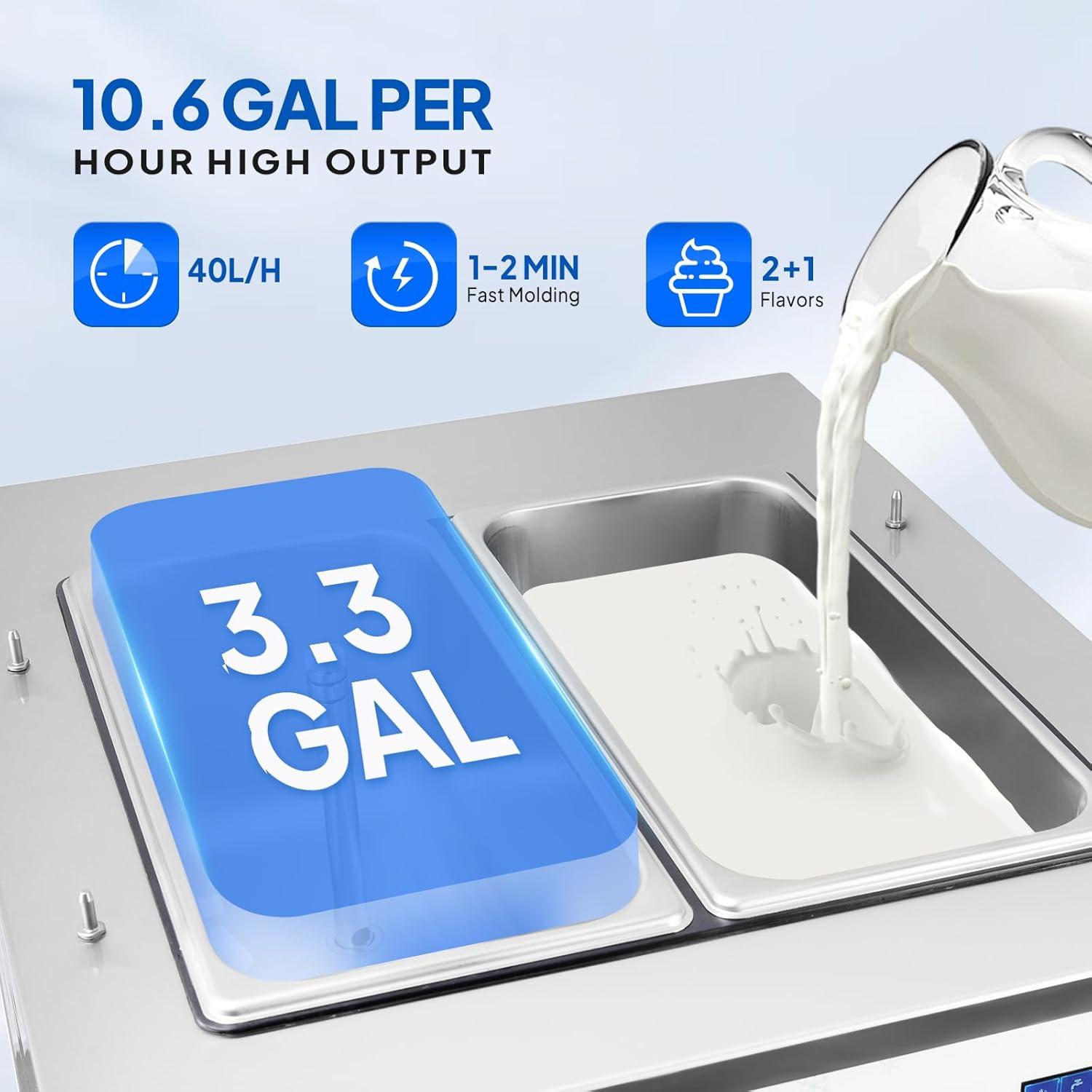 【High Efficiency】 With powerful 2600W compressor and 2*12.5L capacity hoppers, this ice cream maker machine can quickly and easily produce up to 10.6 gallons of ice cream per hour, making it ideal for high-volume settings, ideal for home and commercial use in parties, dessert shops, restaurants, cafeterias, bars and so on